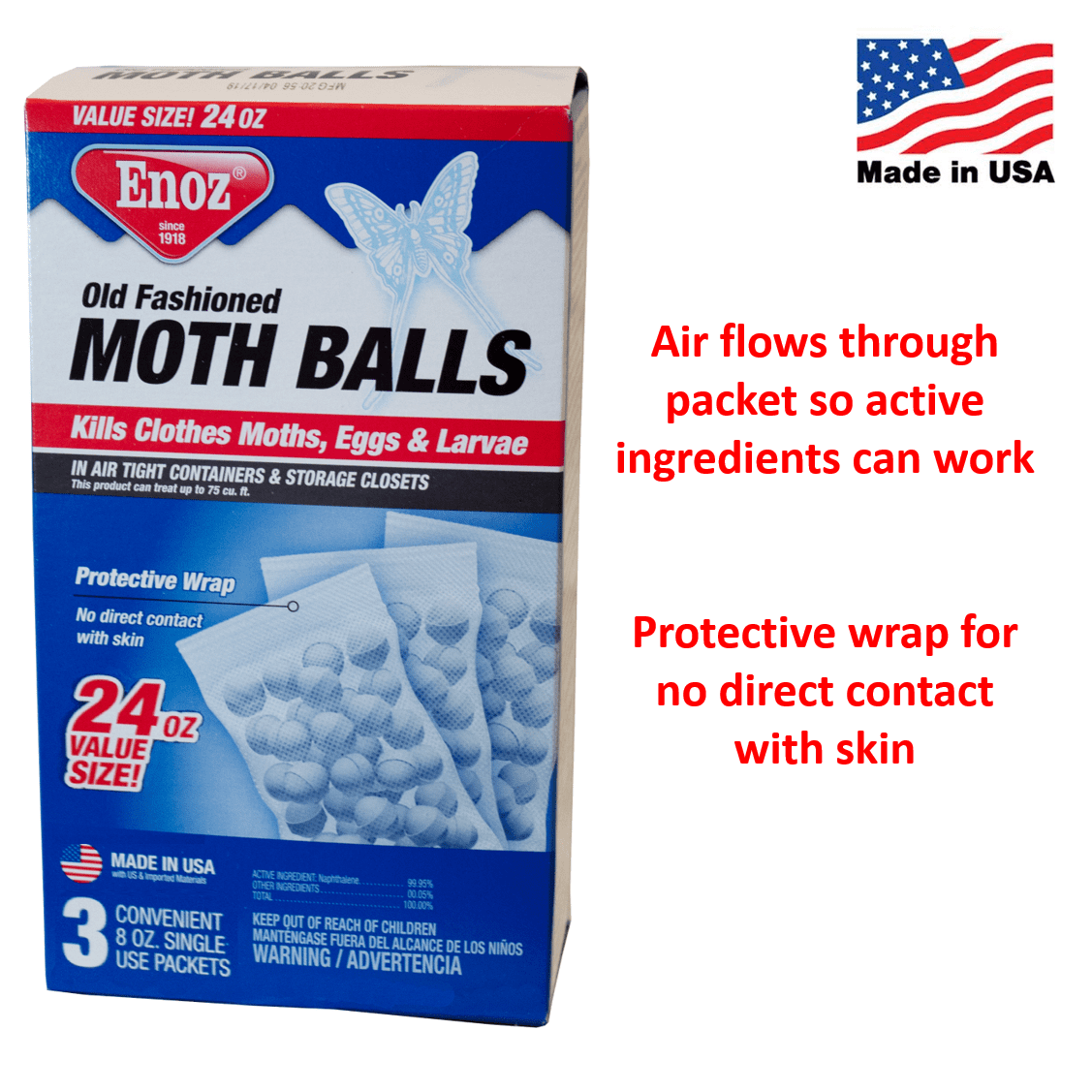 Enjoy quality protection from pesky moths with Enoz Classic Old Fashioned Moth Balls! Enoz Moth Balls, Flakes and Crystals are ideal to use for long-term or seasonal storage of your valuable clothing. Enoz Moth Repellent Preventives penetrate every fold and crease of stored items, ensuring worry free moth protection.