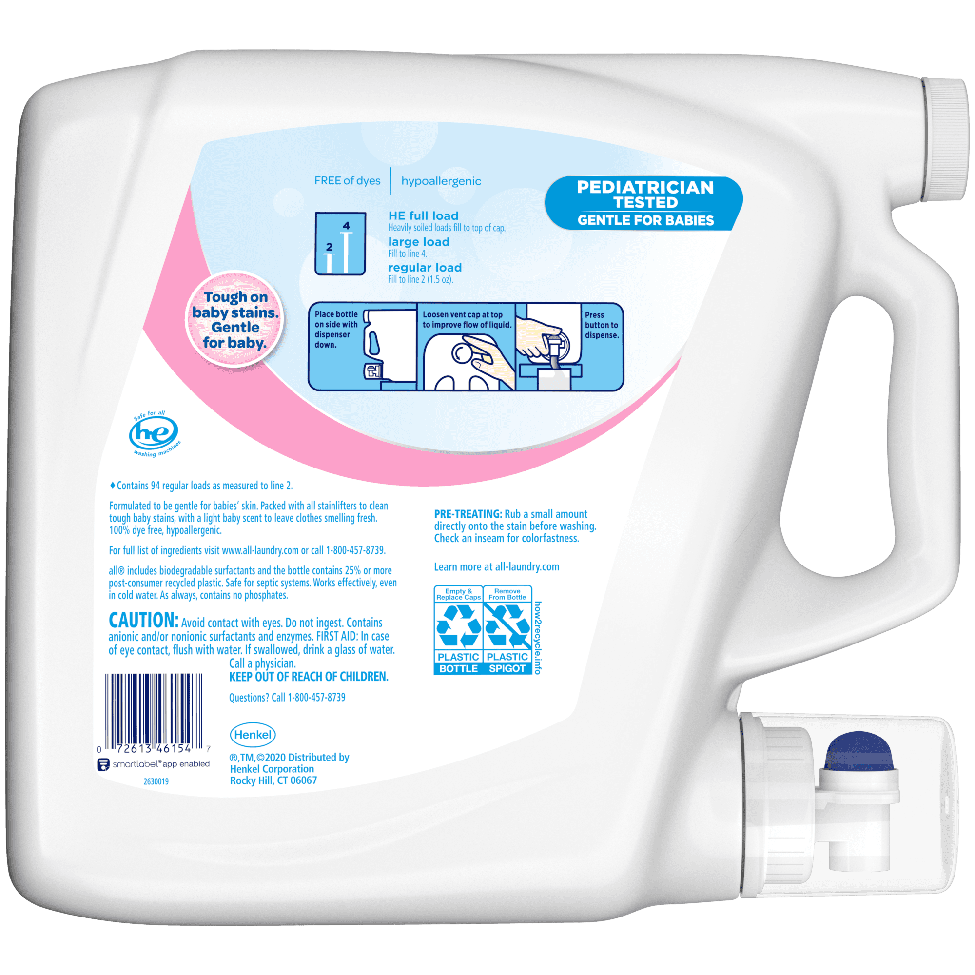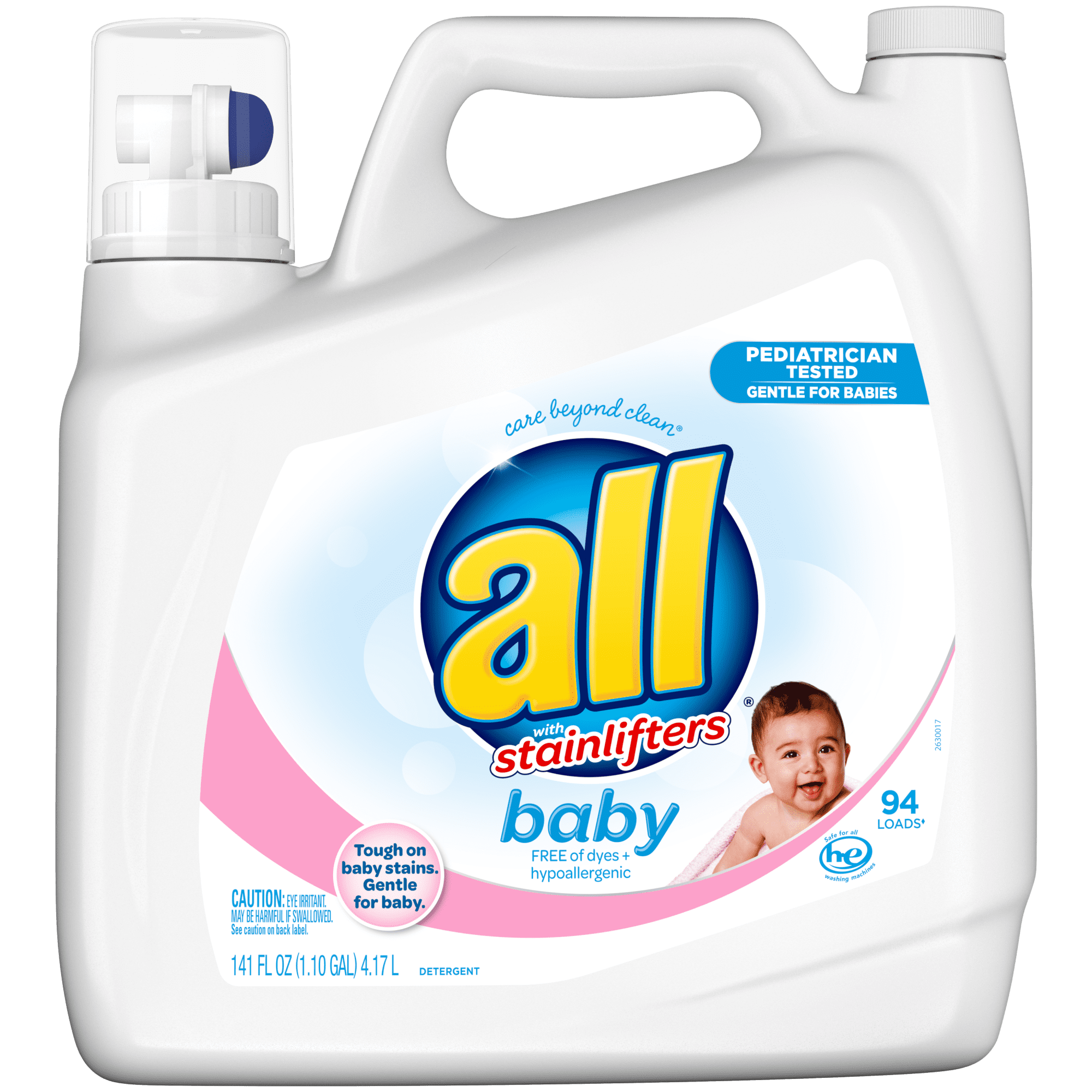 all Baby Liquid Laundry Detergent is tough on stains, but soft enough for babies. Specially formulated to be gentle on your baby’s skin, this fragrance free detergent keeps your baby’s bedding, soft toys, and clothing clean. Wash out tough baby stains with Stainlifters for concentrated cleaning power and without dyes that irritate sensitive skin. Leave your baby’s clothes smelling fresh after a wash with this lightly-scented detergent. all Baby is safe to use in any washing machine. This bottle contains 141-ounces, enough for 94 loads.