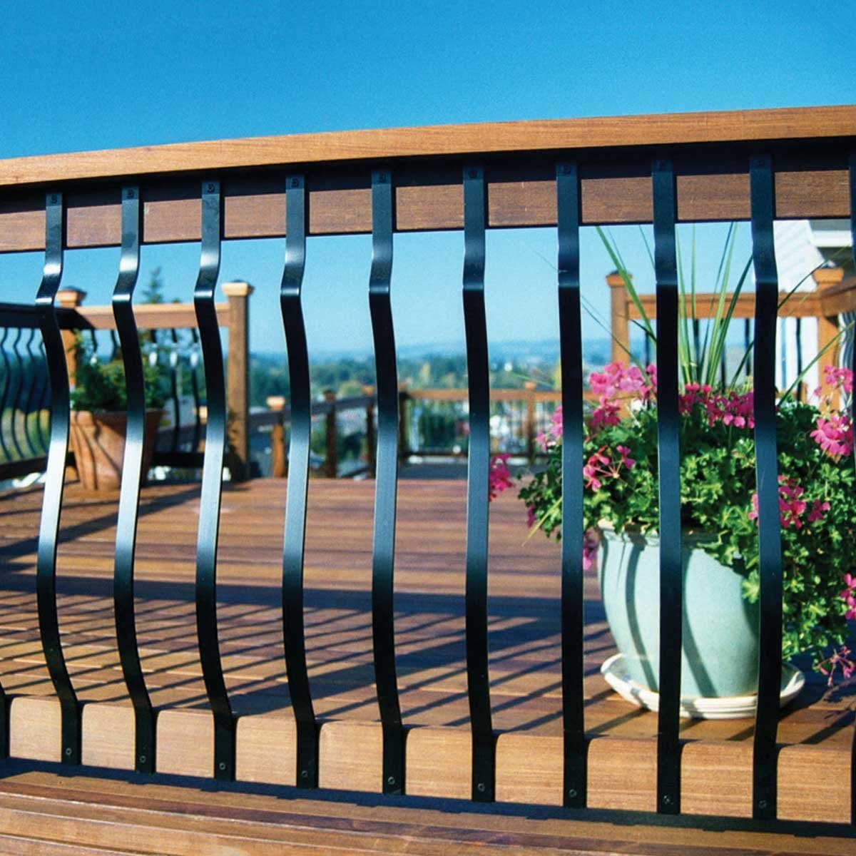 These silhouette-shaped black aluminum balusters will give your railing a unique style. The durable, black powder-coated aluminum balusters look like wrought iron but weigh less. The balusters have a screw hole on the top and bottom. Use 1.25-inch screws to face-mount the balusters to wood, aluminum, or composite rails. NOTE: If you are installing these balusters on a pressure-treated wood rail, be sure to place plastic washers between the wood rail and the baluster to prevent possible corrosion (washers and screws are NOT included).