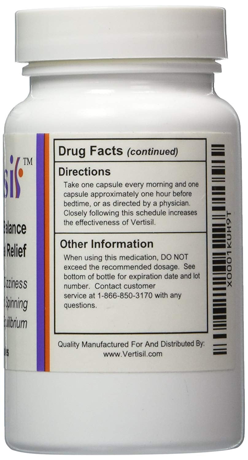 All Natural Vertisil will help to relieve Vertigo Symptoms including Dizziness, nausea and/or vomiting, motion sickness, spinning & swaying sensations without the need for a prescription. Vertisil has the ability to relieve you from your nausea, dizziness, and headaches. There is nothing like Vertisil on the market today. We designed this miracle medicine to be powerful, safe and effective.Relieve Vertigo Symptoms including Dizziness, Nausea,Motion Sickness, spinning & swaying sensations with Vertisil. 60 Caps All Natural Ingredients. 100% Lifetime Money Back Guarantee.