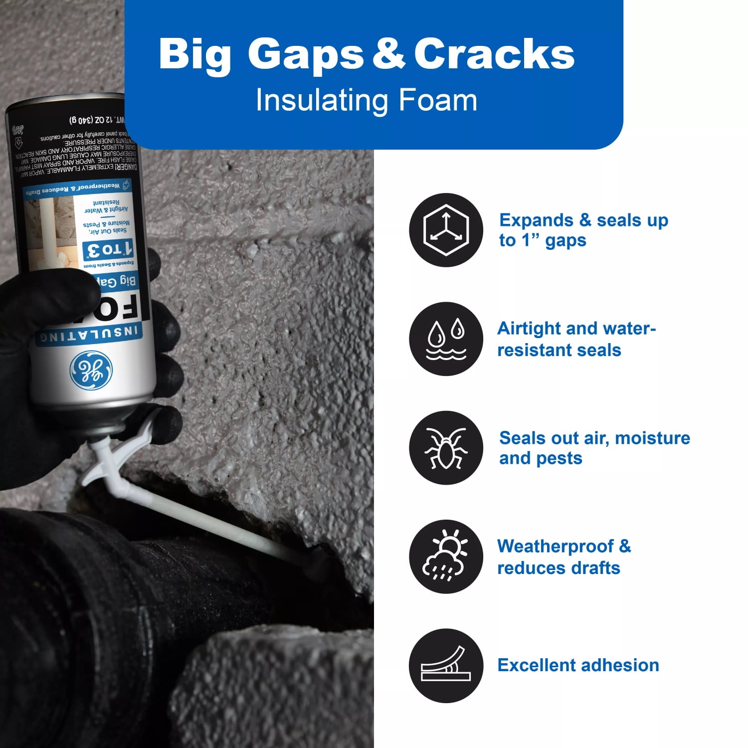 GE-branded Big Gaps & Cracks Insulating Foam expands to fill and seal large gaps and cracks that are wider than 1-inch. Block out pests, moisture and drafts with a powerful airtight and water-resistant seal that helps lower energy costs and prevent mold and mildew growth. Use this foam sealant indoors or outdoors to weatherproof, spot insulate or seal large gaps and cracks up to 3-inches in areas like basements, crawl spaces, foundations, under baseboards, around plumbing, around HVAC ductwork and more. Backed by a lifetime guarantee, GE-branded Gaps & Cracks Insulating Foam has the advanced flexibility and premium durability needed to create long-lasting, weatherproof seals you can trust.