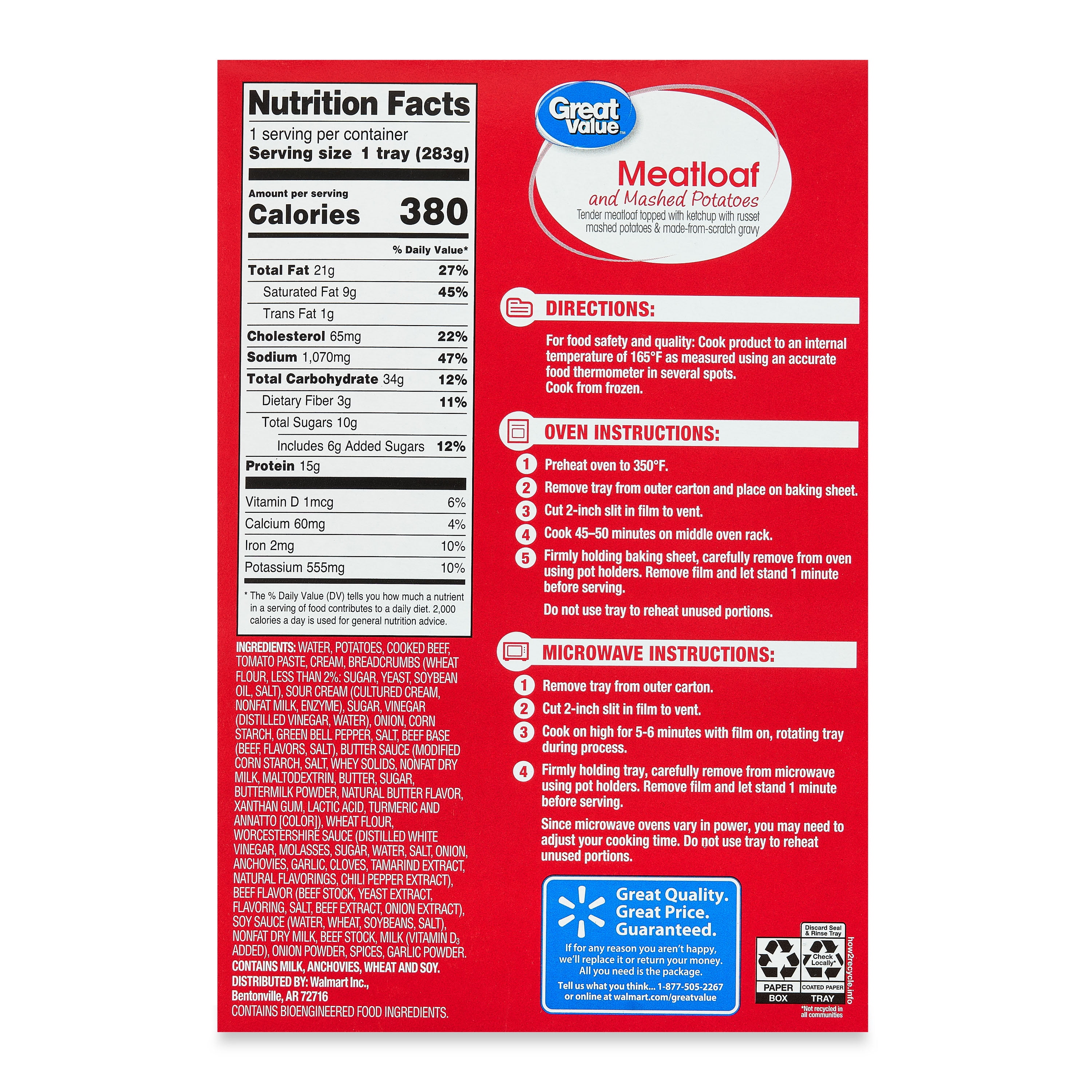 Great Value Meatloaf and Mashed Potatoes, 10 oz (Frozen):