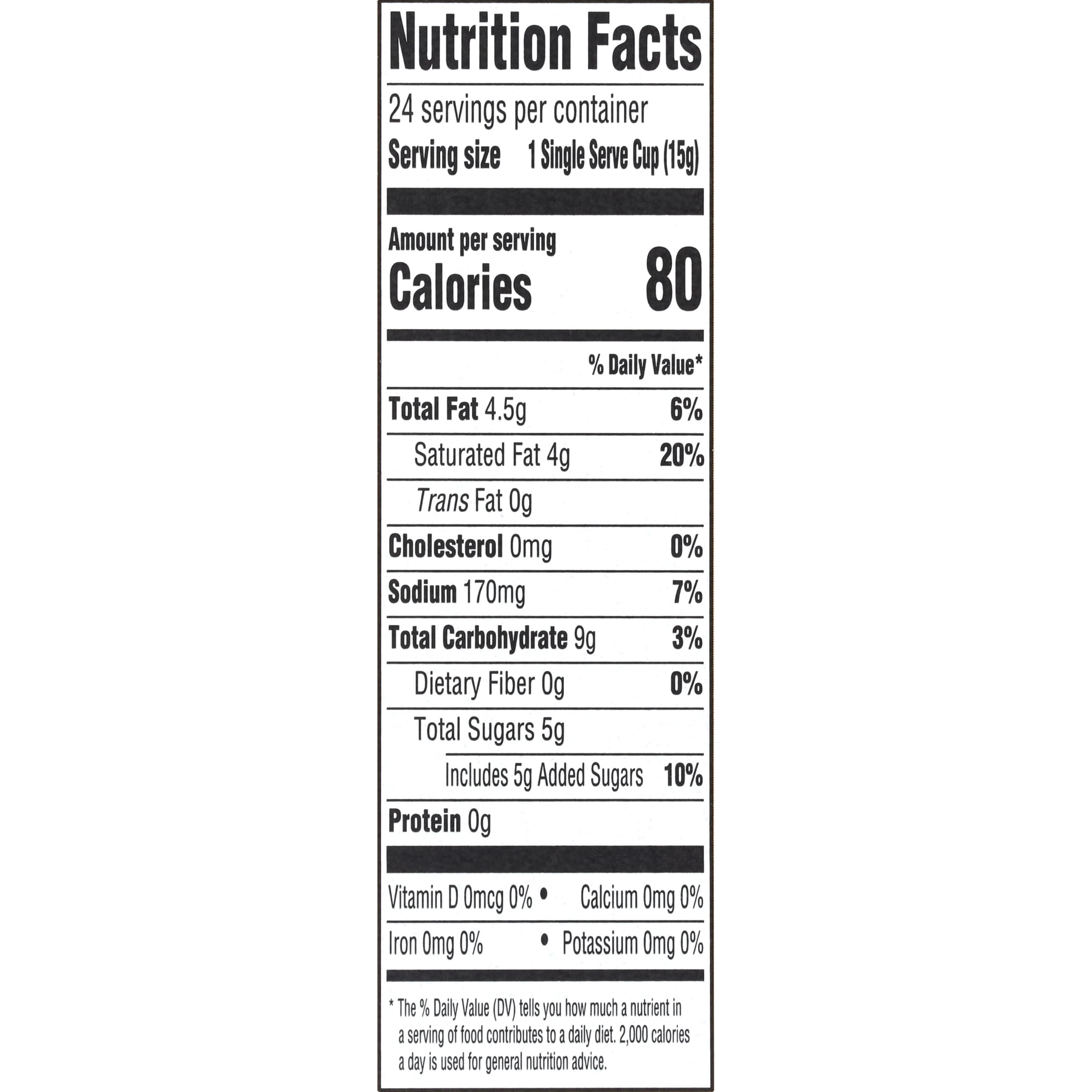 A hot cappuccino drink, mildly sweet, with a pleasant creamy Caramel flavor. The cappuccino is packed in a single serve cup designed for use by owners of Keurig coffee makers. Approved by the Union of Orthodox Jewish Congregations of America. Our goal is to keep the online nutrition information up-to-date and accurate. However, we always recommend that you check the labels, or call the manufacturer, for the most up-to-date ingredient and nutritional information.