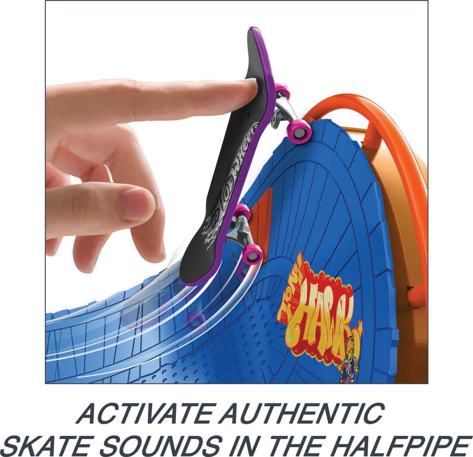 The Hot Wheels Skate Amusement Park Skate Set is the ultimate skate destination packed with wicked obstacles, rad designs and skate-activated sounds for an amped-up play experience! This massive playset is ready for epic finger-boarding stunts with ramps, ledges, rails and halfpipes as well as trigger buttons that activate awesome music mid-shred. It comes with a board designed in collaboration with legendary skater Tony Hawk and a pair of removable skate shoes that help groms get the feel of the board as they master tricks. Pair this set with other sets to create a colossal skate park with unlimited stunting possibilities. Each sold separately, subject to availability. Colors and decorations may vary.