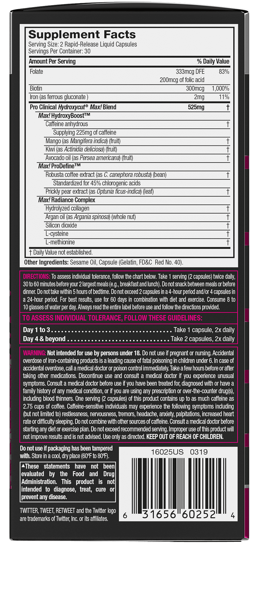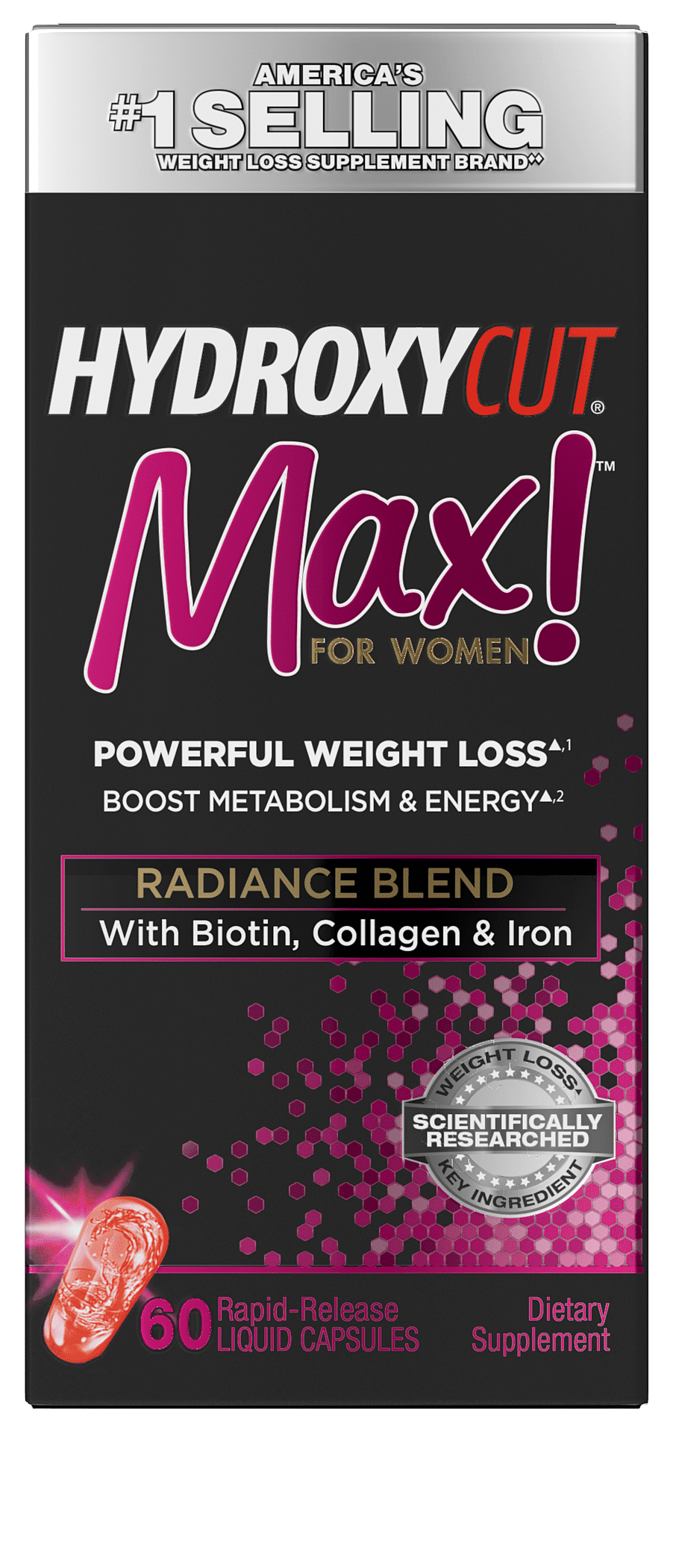 HYDROXYCUT MAX Every woman knows that when you feel amazing, you practically glow. That’s why we’ve designed this unique formula with you in mind. With powerful weight loss, fast-acting energy, and the female-friendly ingredients, folic acid and iron, you really can have it all. Slip the rapid-release liquid caps in your purse for a convenient way to stay energized throughout your busy day. DESIGNED SPECIFICALLY FOR WOMEN Your body deserves only high-quality, premium ingredients, and you should never settle for anything less. That’s why we’ve included ingredients important to women, plus a Radiance Complex for hair, skin and nails. It’s time to slim down, look fabulous and feel glowing! SCIENCE BASED WEIGHT LOSS Get the weight loss benefits of a key ingredient researched to show results in two scientific studies. Subjects taking the key ingredient (C. canephora robusta) for 60 days lost an average of 10.95 lbs. versus the placebo group, which lost an average of 5.40 lbs. Both groups followed a low-calorie diet. In a separate 8-week study, subjects taking C. canephora robusta lost an average of 3.7 lbs. versus the placebo group, which lost 1.25 lbs. Both groups followed a calorie-reduced diet and performed moderate exercise.