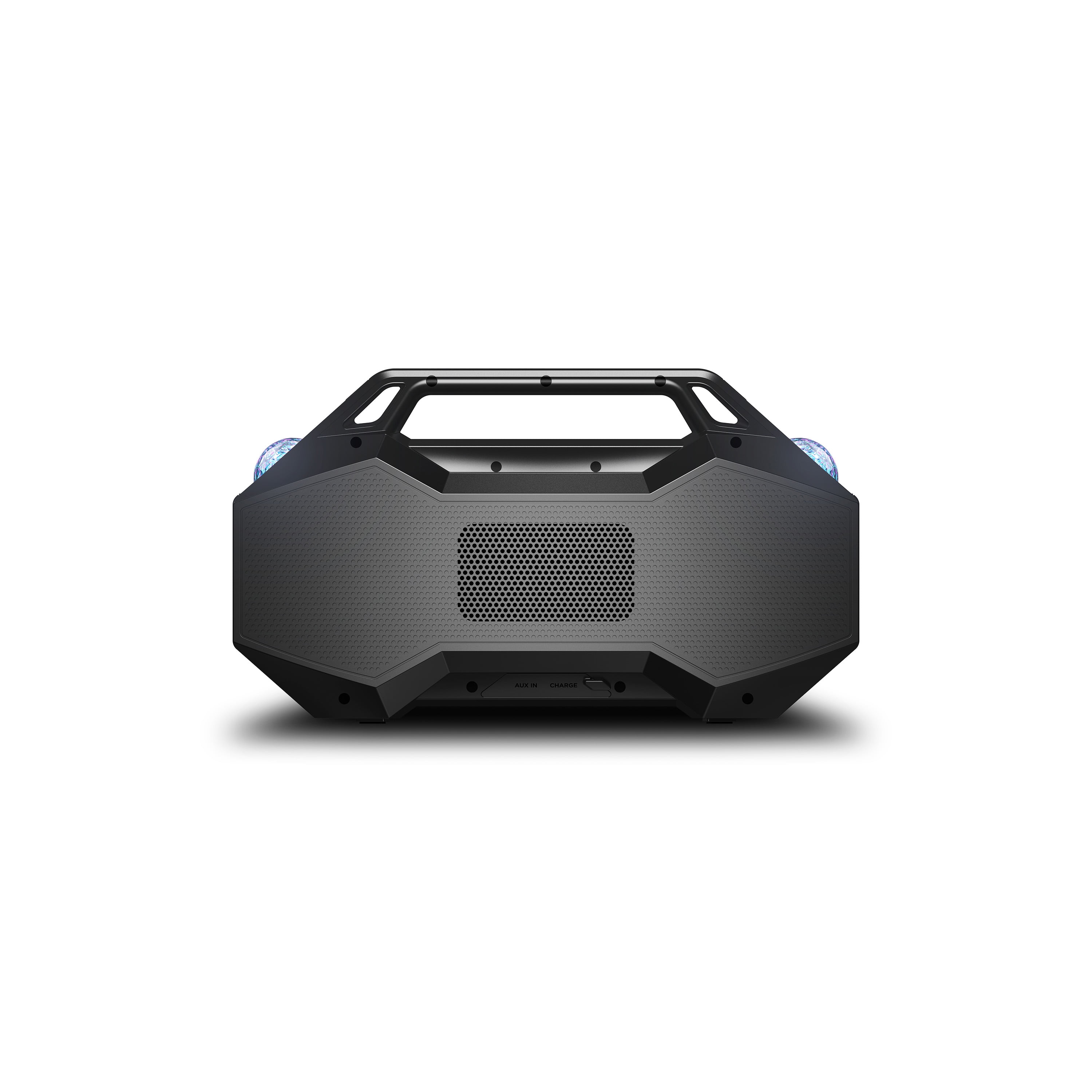 High power portable Boombox with Party Starter Lights Whether you’re having an event in the backyard, skateboarding in the park, or floating in the pool, you want your favorite music with you. Party Rocker Go is a water resistant high power portable boombox that streams music wirelessly from any Bluetooth enabled device. This 60 Watt boombox speaker is rated at IPX5, so it is safe to leave in the rain or by the pool. With the new Party Starter Lights you can have an instant party atmosphere with multi-color lights that beat sync to the music. Plus, there is a Bass radiator with multi color lighting so you can hear and see the bass bump and glow in multiple colors. If you want to play instant DJ with a friend, Party Rocker Go has Dual Connect Audio where you can simultaneously connect 2 phones for a seamless transition of songs. With a built in rechargeable battery, ION Audio Sound XP app to control audio and lighting, and FM radio with presets you can count on hours of uninterrupted fun.