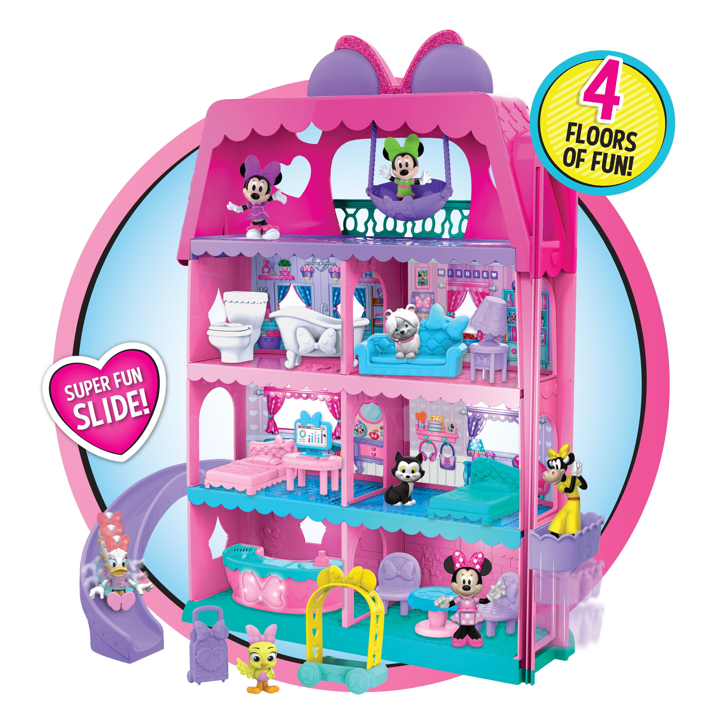 - Playset includes: Bow-Tel Hotel, slide, Minnie Mouse bow, electronic reception desk, articulated Minnie Mouse & Daisy Duck figures, Snowpuff figure, two beds, lamp, sofa, bathtub, toilet, hammock, computer desk, table, two chairs, luggage cart, and one piece of luggage.