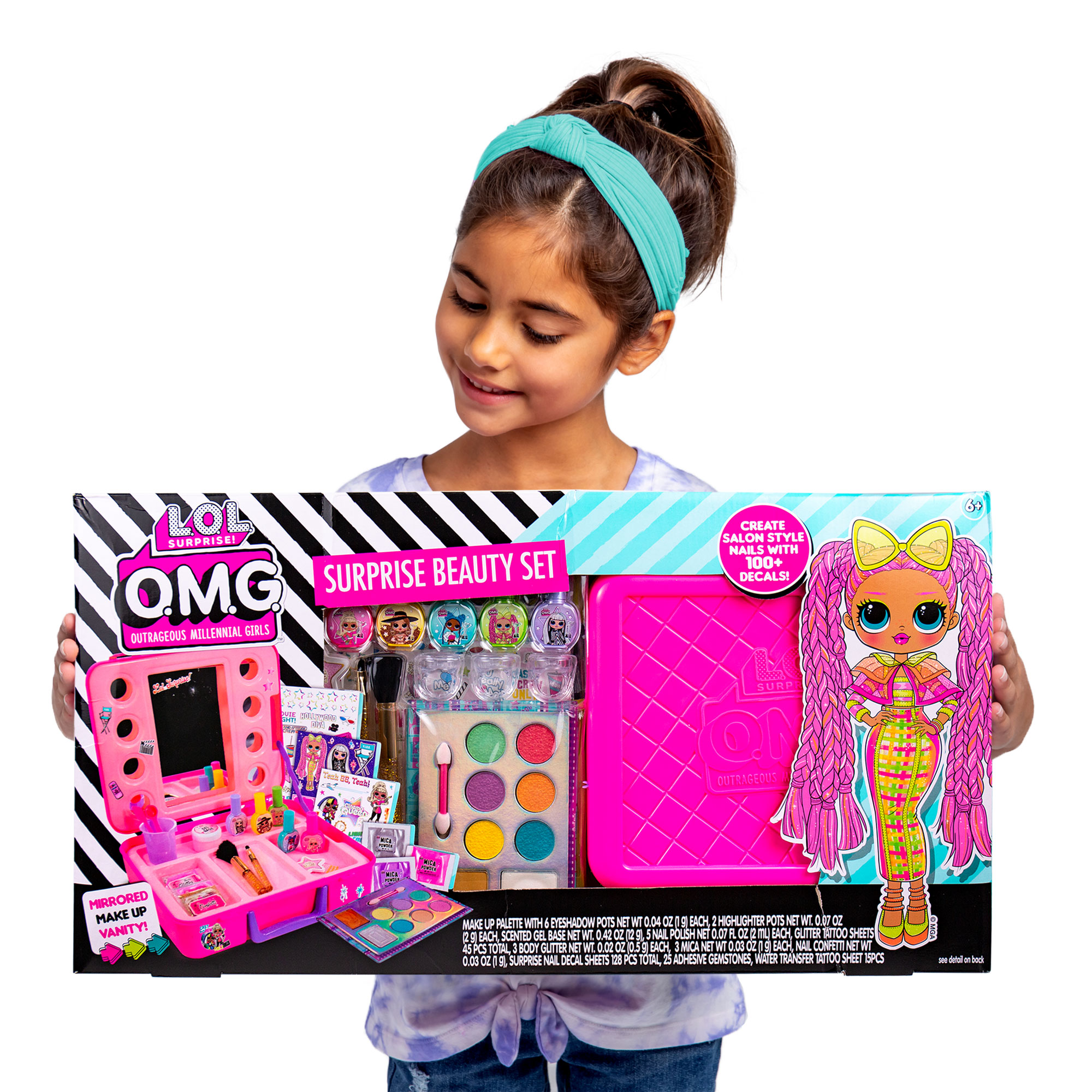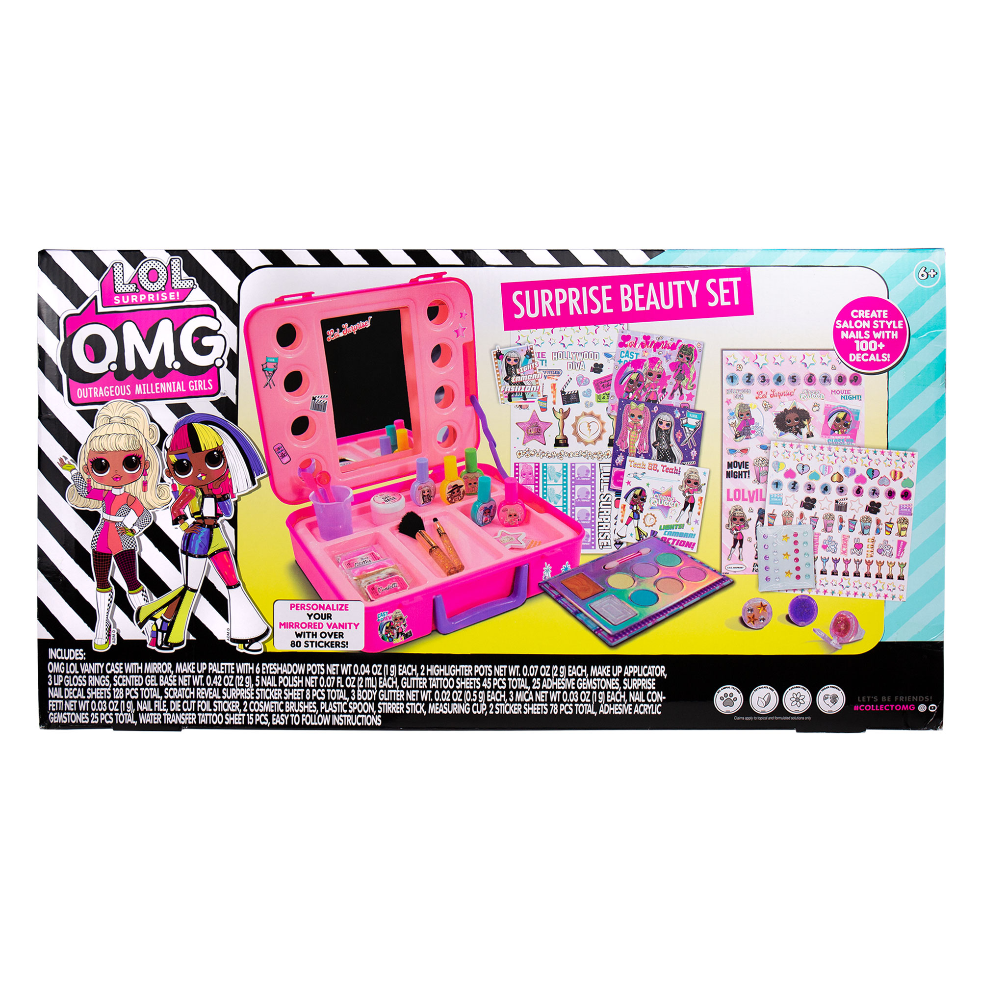 - Set Includes: 1 L.O.L. Surprise! O.M.G. Double Feature Foldable Mirrored Vanity (10 in. x 3 in. x 9 in.), 25 Assorted Acrylic Gemstones, 1 Sheet Temporary Glitter Tattoos, 1 Eyeshadow & Highlighter Pallet With Applicator (1 Pink, 1 Orange, 1 Teal, 1 Green, 1 Yellow, 1 Pink Sparkle, 1 Iridescent Shimmer Highlighter, 1 Gold Shimmer Highlighter), 5 Nail Polishes (1 Yellow, 1 Pink, 1 Green, 1 Teal, 1 Violet), 1 Gold Cosmetic Brush, 3 Empty Lip Gloss Rings, 1 Scented Lip Gloss Base, 3 Mica Powder Colors (1 Pink, 1 Silver Shimmer, 1 Violet), 1 Spoon, 1 Stirring Stick, 1 Measuring Cup, 1 Die-Cut Foil Sticker, 1 Nail File, 1 Packet Heart-Shaped Confetti, 1 Nail Decal Sheet, 1 Scratch Art Sticker Sheet, 2 Sticker Sheets, 3 Pre-Printed Designs, 1 Temporary Tattoo Sheet, 25 Adhesive Nail Gems, 3 Body Glitter Packets (1 Silver, 1 Gold, 1 Pink), Easy-to-Follow Instructions
