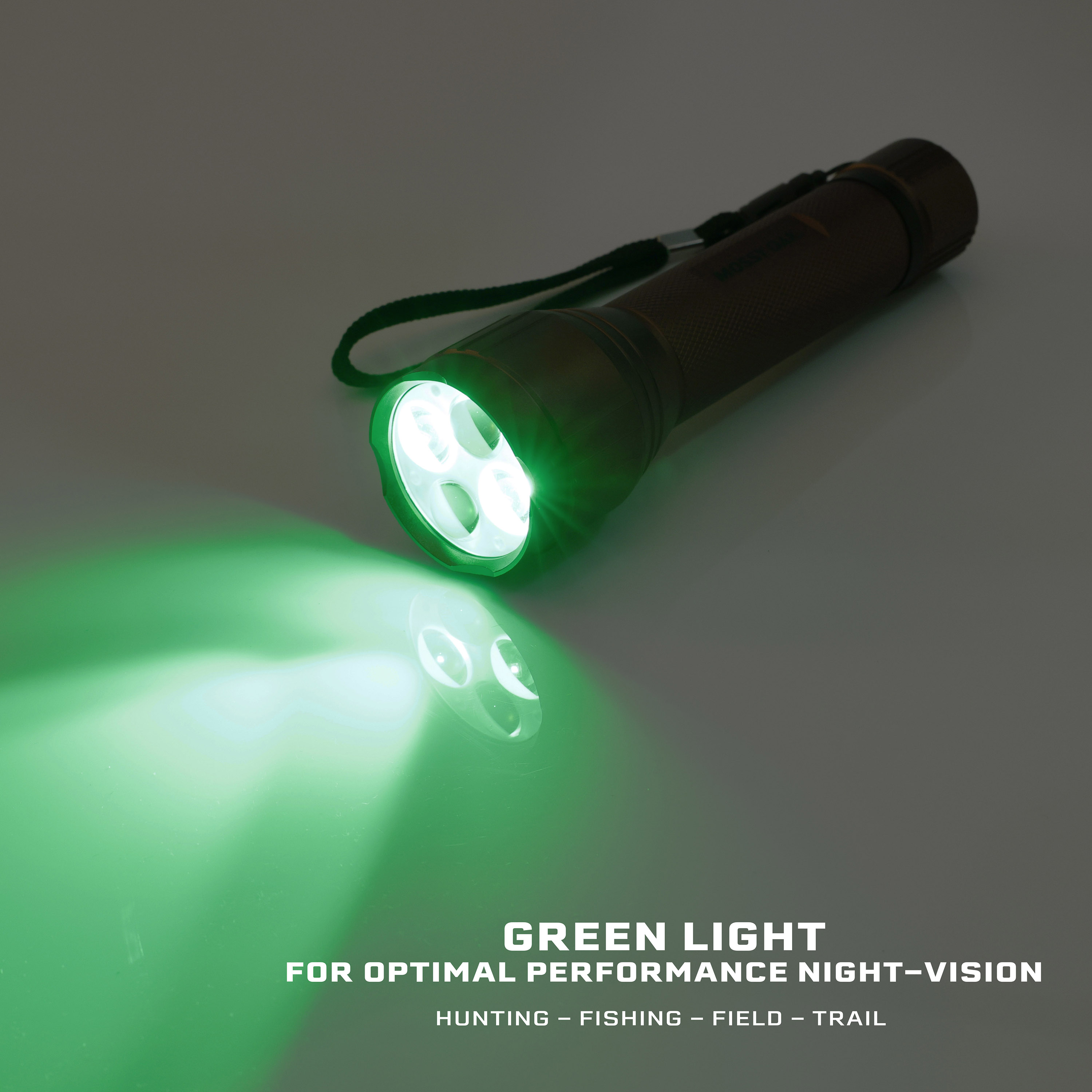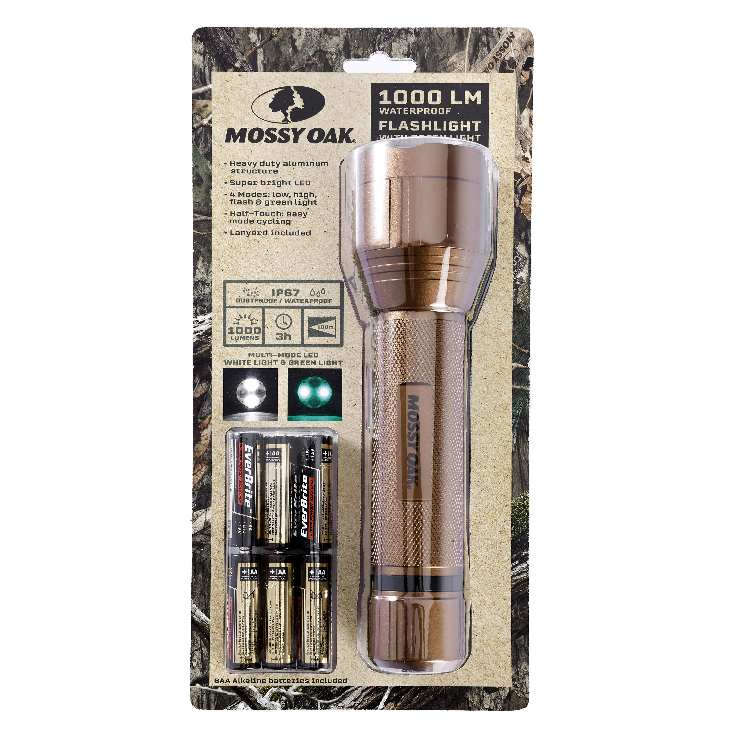 Bring the Mossy Oak Green LED Flashlight to your next hunt! Complete with 6AA alkaline batteries, this flashlight works at peak performance as soon as it arrives. Constructed with a heavy-duty aluminum structure and an IP67 waterproof rating.The super bright LEDs produce a massive 1000 Lumens of light. This light has 4 modes: low, high, strobe, and green light. Green lights allow for better contrast at night. The powerful 1000 lumens allow you to see up to 100 meters ahead, with 3 hours of battery life on the highest mode or 10 hours on low mode at 300 lumens. Never get stuck without light by keeping the Mossy Oak Green Light Flashlight on hand.