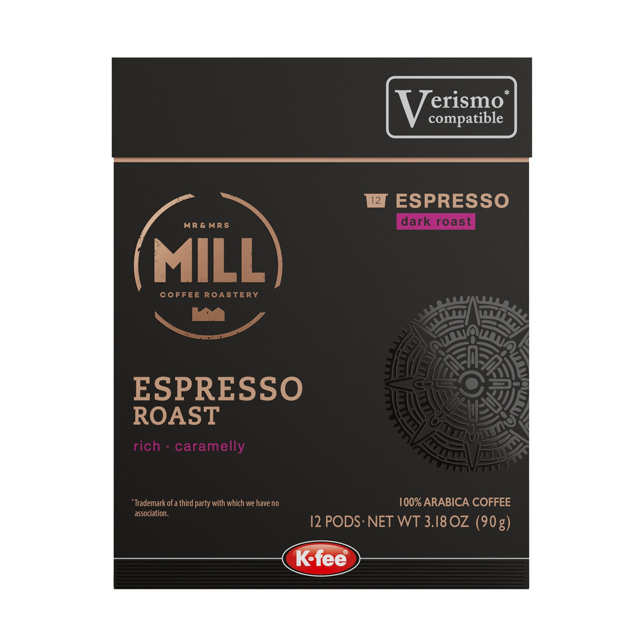 MR & MRS MILL ESPRESSO ROAST DARK ROAST ESPRESSO VERISMO* COMPATIBLE PODS Be brave, be curious, and tap into your inner power. This dark roast espresso puts you in the perfect mood. It is full-bodied, bold and strong with spicy notes and a hint of caramel sweetness. We are explorers and connoisseurs, pioneers and visionaries. We track down the finest coffees for you with passion and inexhaustible curiosity. Our unique creations and their outstanding quality will inspire you and all your senses. Look forward to your own personal moments of indulgence â the likes of which youâve never experienced before â from Mr & Mrs Mill. If you own a Verismo* single serve coffee maker, you will be pleased to hear that Verismo* was based on the K-fee system. Now we offer compatible capsules based on K-fee technology for your Verismo* brewer, with Mr & Mrs Millâs interpretations of coffee styles you surely will love at first sip.