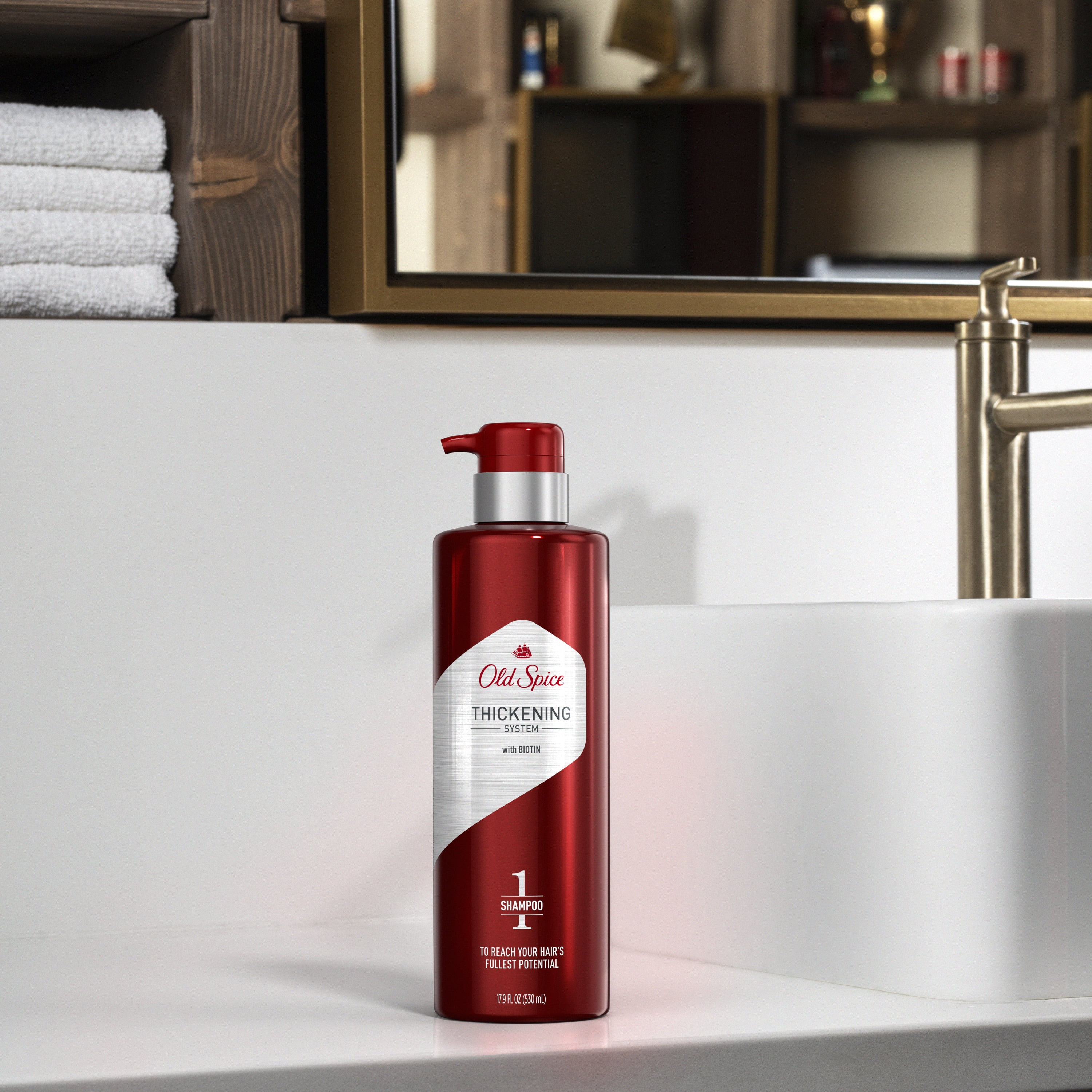 - Old Spice shampoo infused with biotin is designed to cleanse and lift the hair for the ultimate fullness