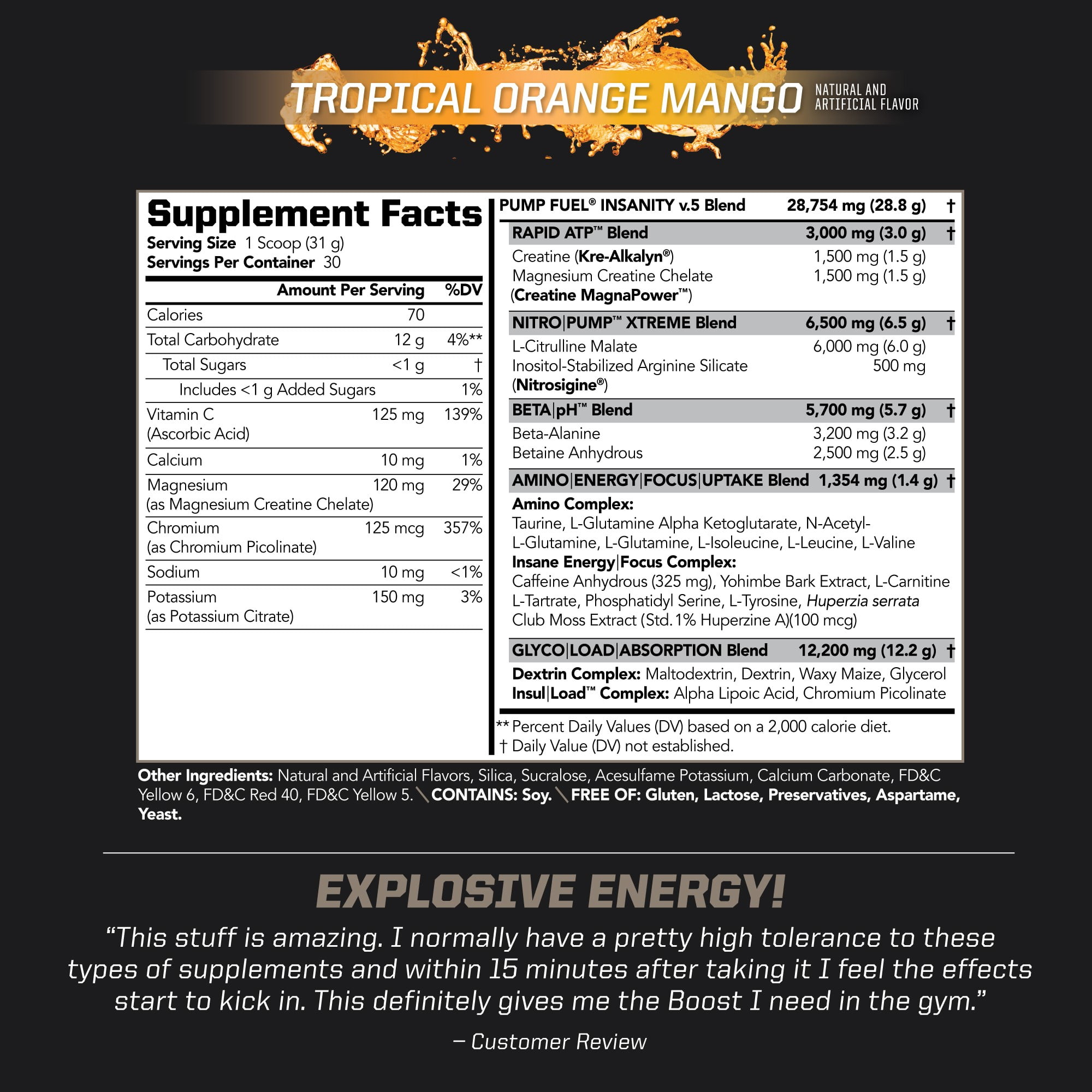 Pump Fuel® ULTRA INSANITY is a highly advanced pre-workout solution formulated with all the crucial muscle building and performance-enhancing ingredients needed to help you achieve your goals and maximize your results. This premium all-in-one pre-workout formula is completely sync’d and geared up for full throttle workout explosiveness. Pump Fuel® ULTRA INSANITY includes the same high-quality foundation of base ingredients that are found in Pump Fuel® ULTRA, but INSANITY amps things up a notch with a stronger and more fierce energy factor. If you want that extra edge over your competition, or if you want better results from your workouts, then Pump Fuel® ULTRA INSANITY is your answer! With 30 power-packed servings per container, each scoop of Pump Fuel® ULTRA INSANITY contains the clinically studied and truth-in-labeled ingredients needed for a truly unrivaled experience in the gym, on the field, on the court, or wherever you need to be at your absolute max! With 29 g per serving this fully loaded unmatched pre-workout formula is expertly fueled with the high performance-based ingredients needed to help support maximum muscle power output, incredible muscular strength, and an intense muscle pump like no other! It also provides insanely strong energy levels and the mental concentration or focus to help fuel you through those body-taxing training sessions. With its Glyco|Load|Absorption Blend now amped way up, Pump Fuel® ULTRA INSANITY helps to deliver a healthy supply of fast and slow carbs for a steadier flow of energy throughout your workouts. This blend also helps to replenish muscle glycogen stores, which supports quicker recovery. Pump Fuel® sets the standard and raises the bar for what a complete and premium pre-workout formula should be, so don’t be fooled or punk’d by imitators. Where others fall short, Pump Fuel® excels to carry you beyond your normal thresholds by enhancing your muscular output and endurance.