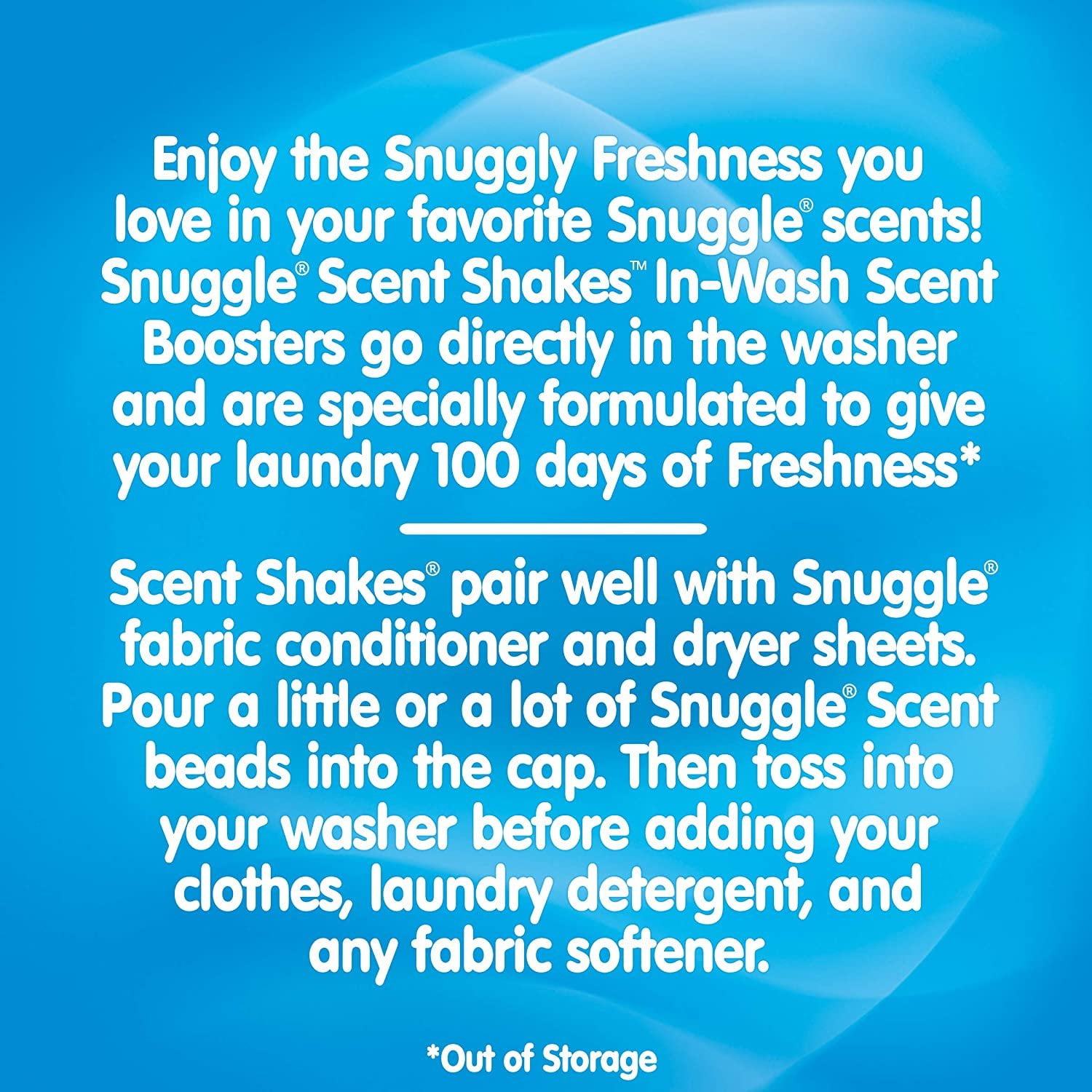 Enjoy the Snuggly Freshness you love in your favorite Snuggle scents! Pairs well with Snuggle fabric conditioner and dryer sheets. Snuggle Scent Shakes In-Wash Scent Booster goes directly in the washer and is specially formulated to give you 100 days of freshness. Pour a little or a lot of Snuggle Scent Shakes beads into the cap. Toss into your washer before adding your clothes, laundry detergent, and fabric softener. Snuggle Scent Shakes dissolve completely in all water temperatures and are great for all types of clothes including activewear and sleepwear. This package includes four 9-ounce bottles of Snuggle Scent Shakes in Blue Sparkle scent.