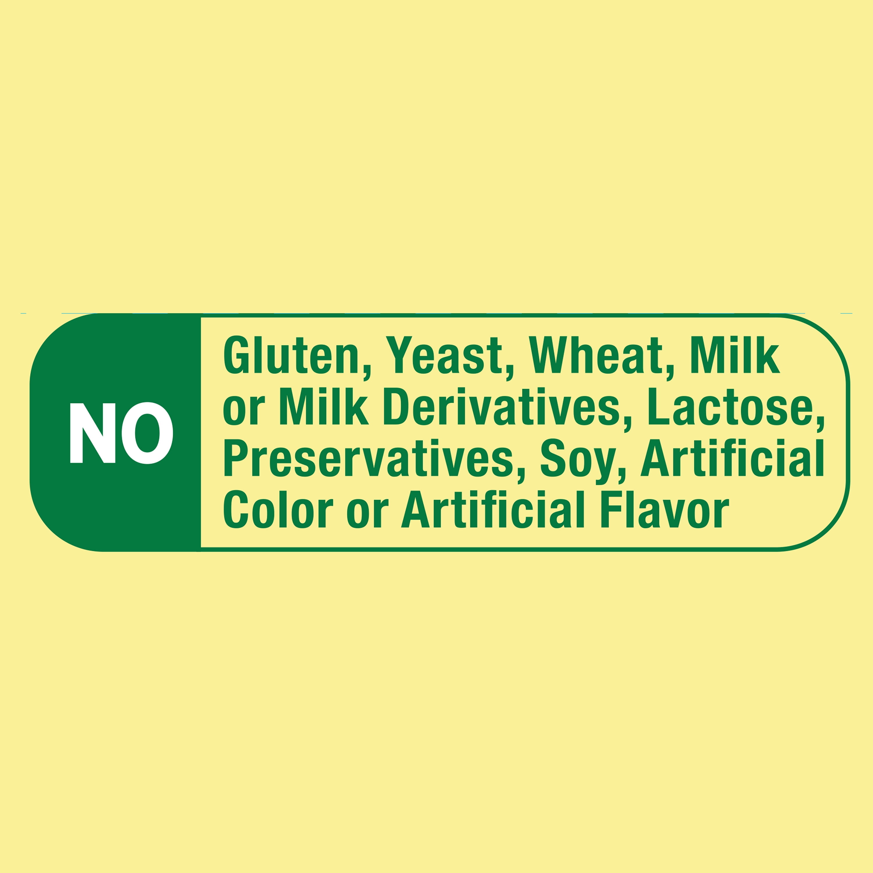 - No gluten, yeast, wheat, milk or milk derivatives, lactose, preservatives, soy, artificial color, or artificial flavor