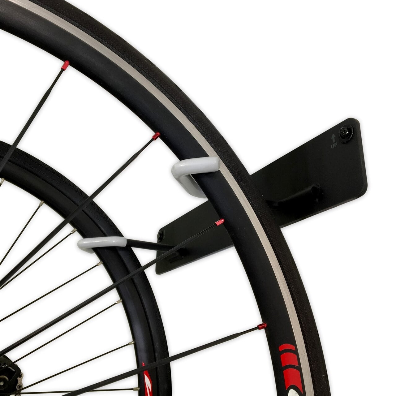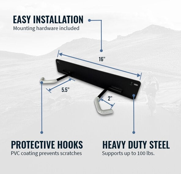 Get organized and hang both of your bikes on the wall with this StoreYourBoard heavy-duty wall storage rack. Use this in your garage, basement, storage shed, or bike shop. Made from solid steel, this fully-assembled rack is an ultra strong, reliable solution to hang your bikes on the wall worry-free. Supports up to 50 lbs per hook, up to 100 lbs total! Durable powder-coating prevents rusting and lasts a lifetime.The minimalist designed is perfect for the biker who has less wall space to work with. Rubber-coated hooks gently hold your bike by the wheel without scratching your rims. A perfect option to get organized and have your bikes ready to go for your next ride! NOT recommended for Fat Tire bikes.