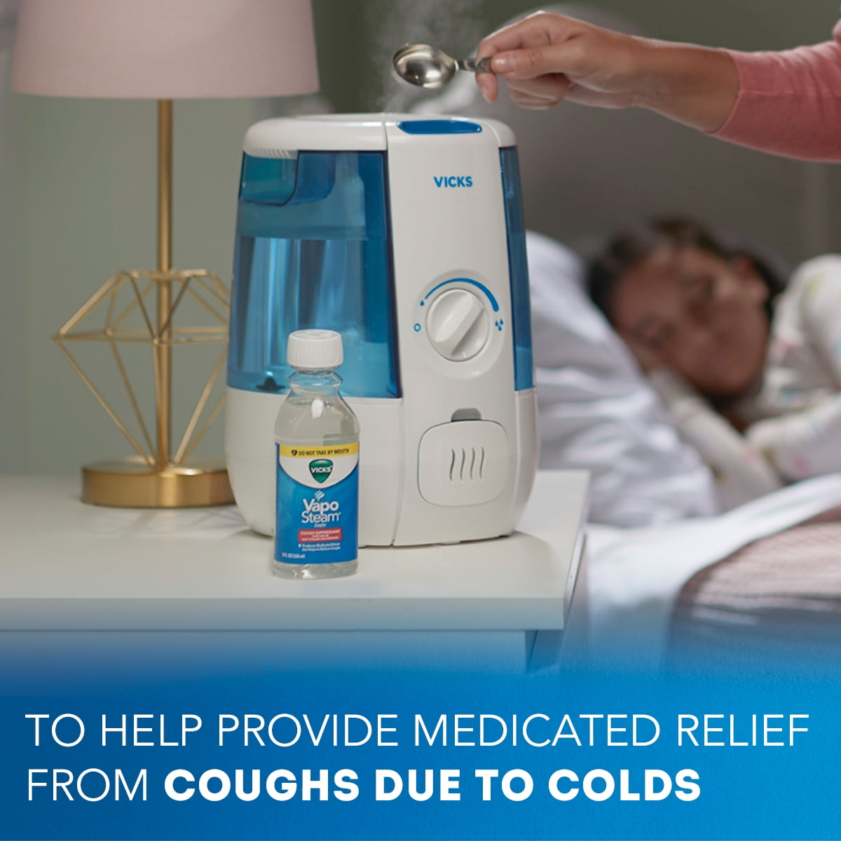 Get help breathing by using this Vicks VapoSteam 8 fl oz. It should be added to a Vicks Vaporizer or other hot/warm steam humidifiers, to increase the action of steam to moisten dry, irritated breathing passages. The VapoSteam camphor can temporarily relieve coughs due to minor throat and bronchial irritation associated with a cold. This product can be used to take care of certain symptoms that make breathing difficult. The humidifier Vaposteam will make a useful addition to other cold and flu products in the medicine cabinet. It will come in handy during certain parts of the year when the weather and conditions make breathing hard. This product is not intended for internal use and should not be given to children under 2 years old. The Vicks VapoSteam 8 fl. oz. can be added to a humidifier and inhaled while the user is comfortably relaxing, to promote a fast recovery.