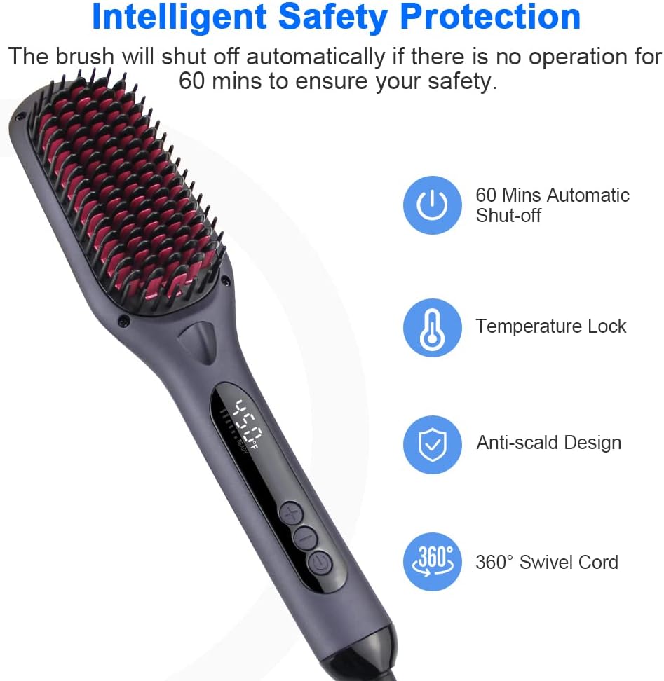 Safety Protection With Anti-Scald & Auto-OffJust enjoy straightening and styling your hair and leave side worries about getting burned or shocked by the heat. And this hair straightening brush will automatically shut off if no operation for 60 mins.