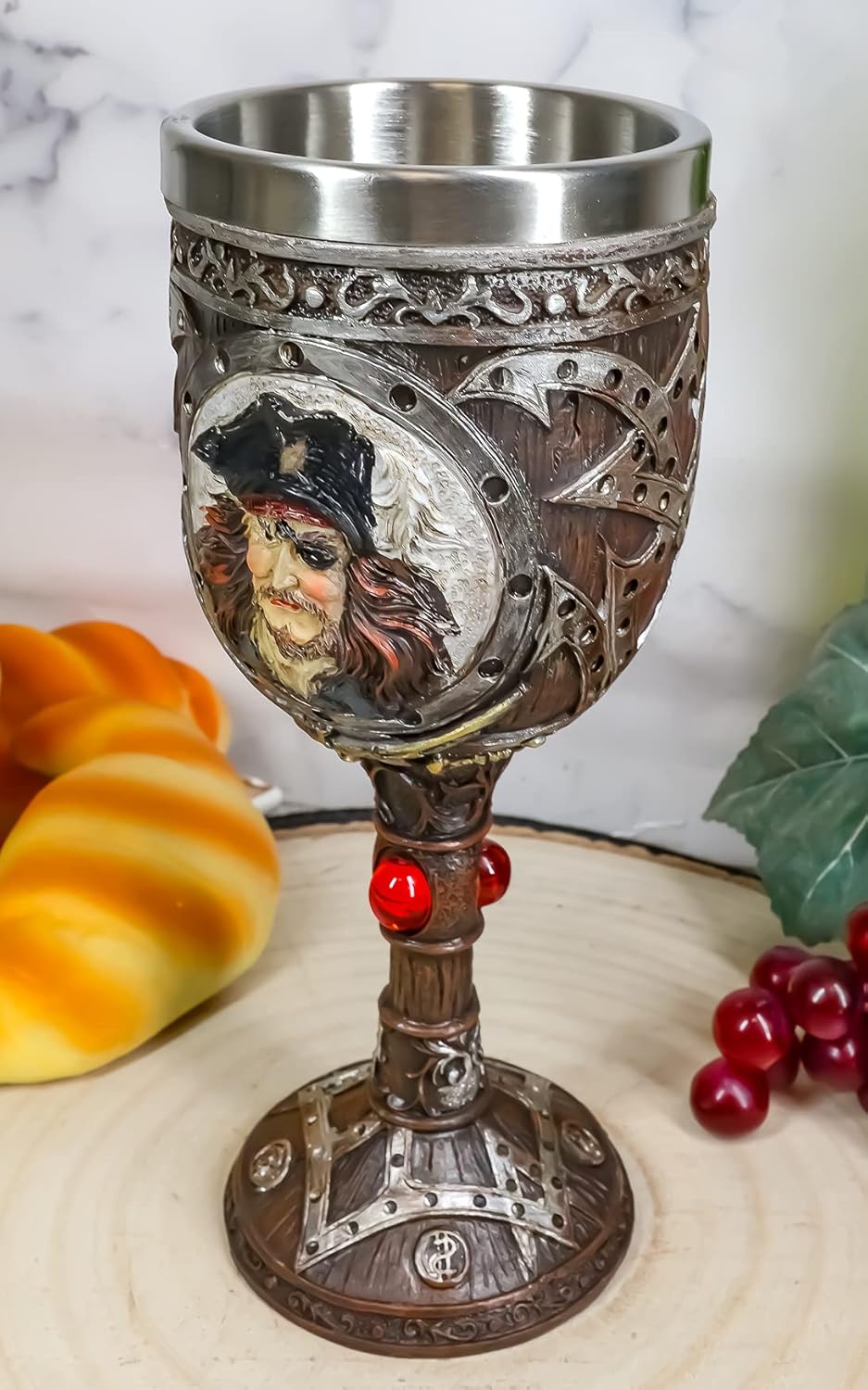 This Pirate Themed Wine Goblet is made of fine polyresin topped with a stainless steel cup liner, hand painted and polished individually. The stainless steel liner is safe for drinking and washing. The colorful resin body should only be cleaned with warm cloth (without soap).