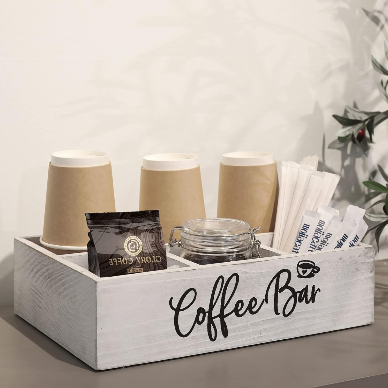 Station Organizer White Coffee Bar Organizer for Counter Wooden Coffee Pods Holder Storage Basket Farmhouse K Cup Organizer for Countertop Rustic Coffee Accessories Organizer