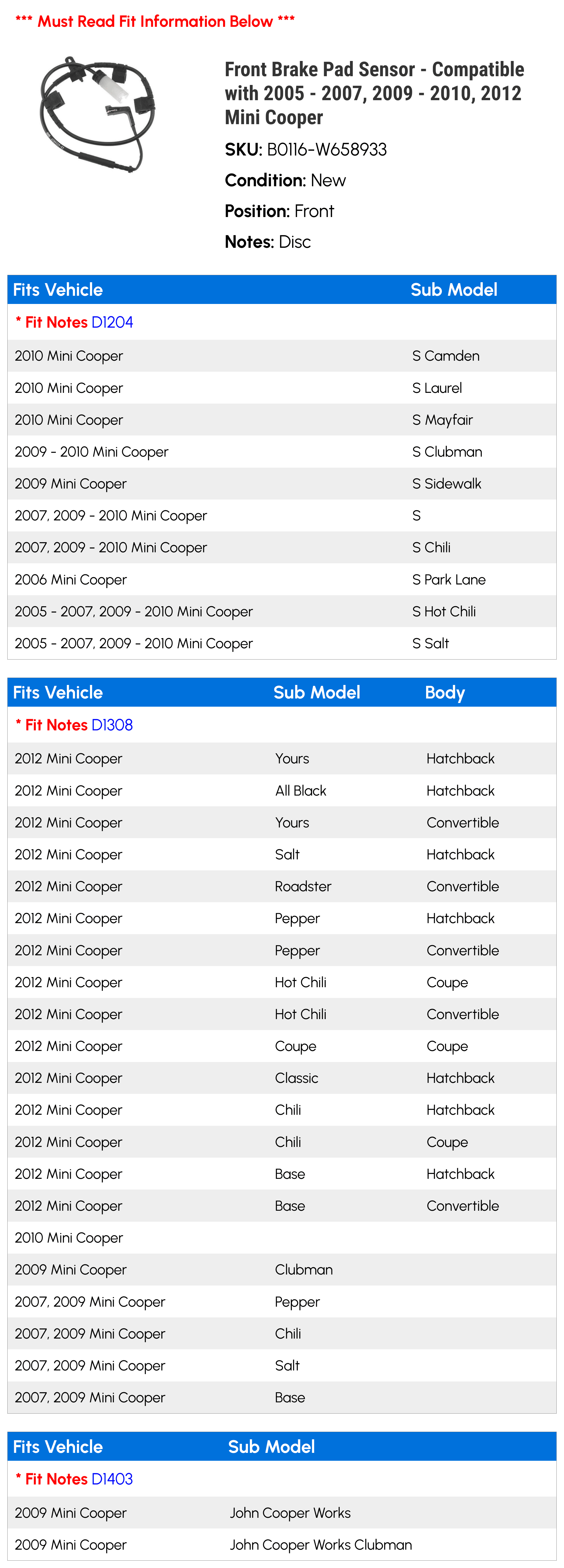 Front Brake Pad Sensor – Compatible with 2005 – 2007, 2009 – 2010, 2012 Mini Cooper 2006