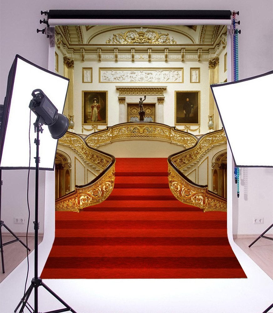 HelloDecor Polyester Fabric European Retro Interior Design Backdrop 5x7ft Photo Frames Red Carpet Handrail Wall Photography Background Video Studio Props Children Baby Kids Portraits