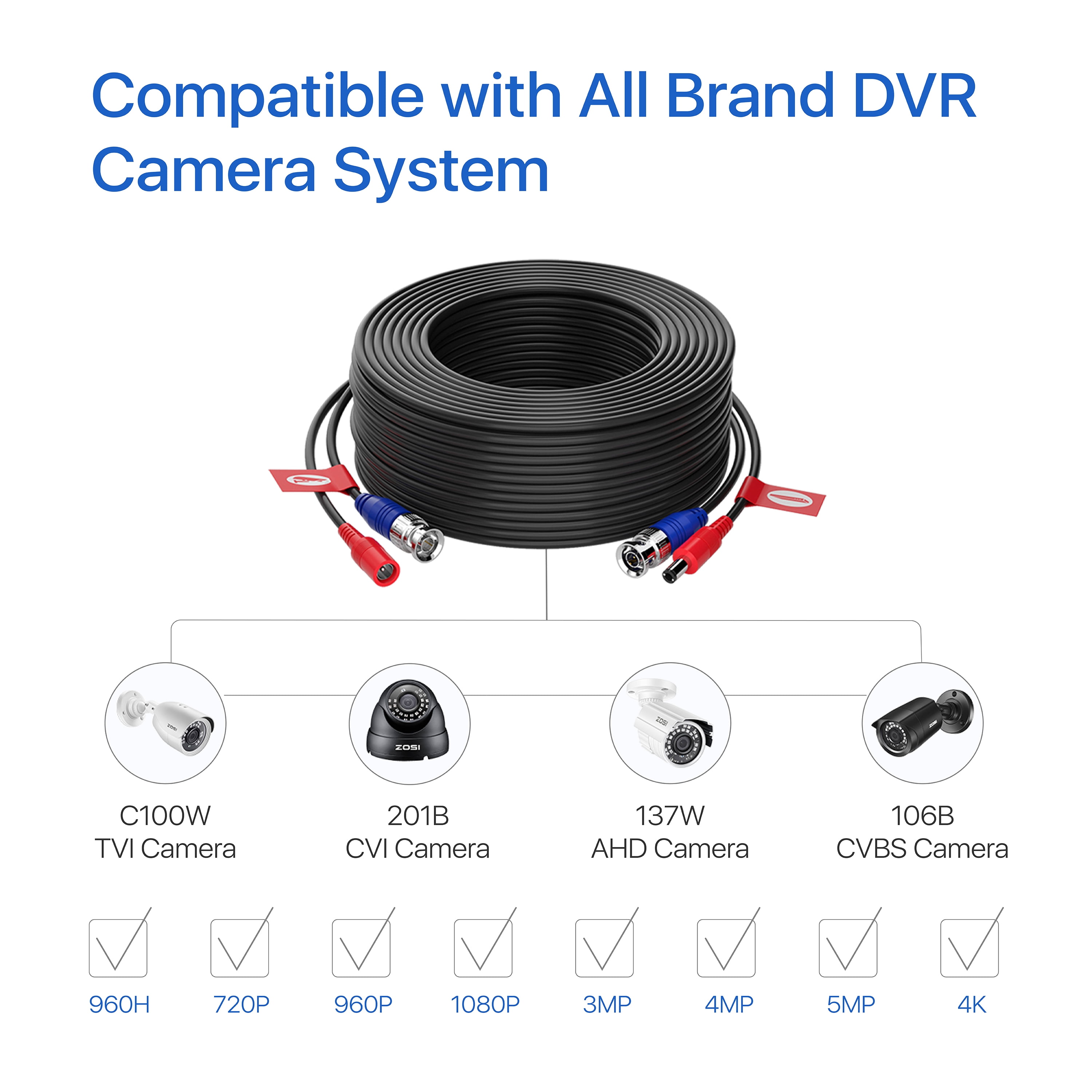 ZOSI 4 Pack 60Feet 18m 4K 8MP 5MP 1080P All-in-One CCTV Video Power Cables, BNC Extension Security Wire Cord for Video Surveillance Camera DVR System With BNC RCA Connector and 100pcs Cable Clips