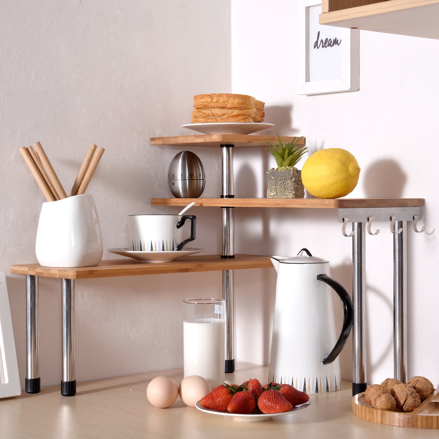 Bamboo 3 Tier Kitchen Corner Shelf Desktop Rack Unit Stainless Steel Kitchen Office Desk Organiser Bookshelf Display Shelves