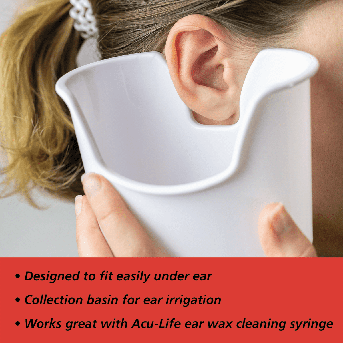 Acu-Life Ear Basin is used to catch discharge while cleansing the ear. Its contoured design and one-piece seamless plastic is molded to fit comfortably under the ear. This product may be used with our Ezy Dose Ear Irrigator Syringe and Ear Wax Removal Syringe.