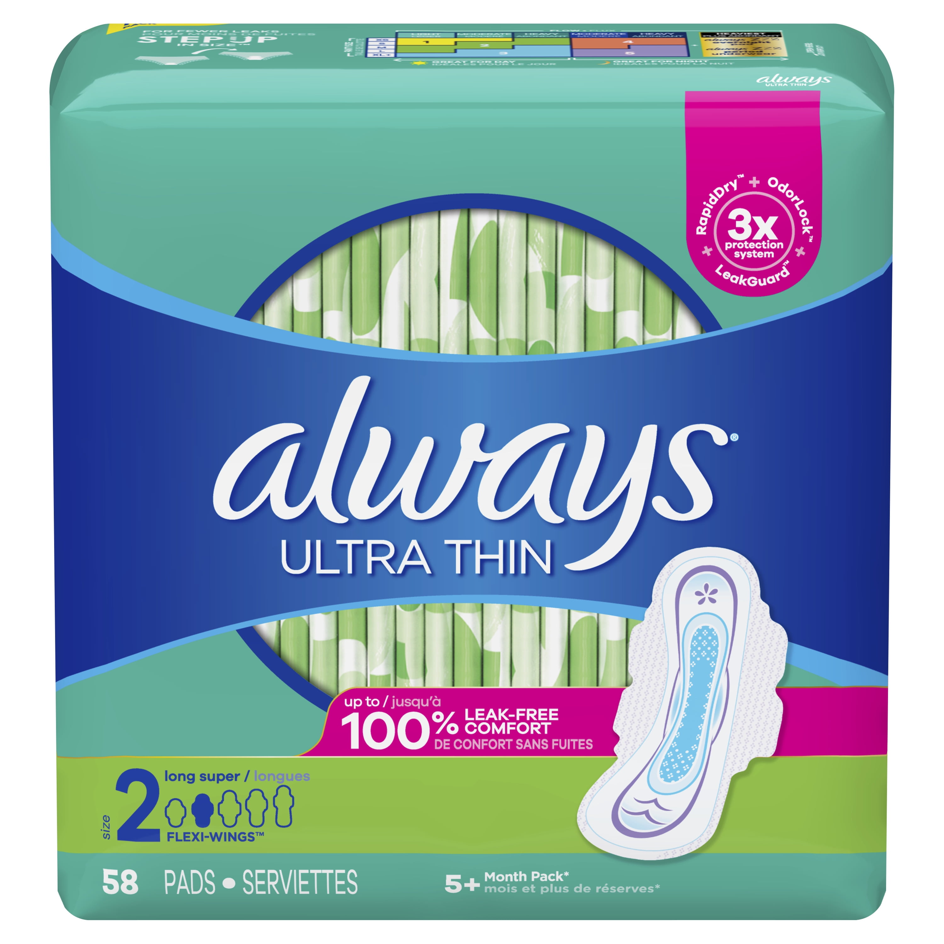 If you think all pads are exactly the same — think again. Discover the completely reinvented* Always Ultra pads with 3X Protection System for up to 100% leak-free comfort. Thanks to RapidDRY, the pads absorb two times faster than the leading store brand to wick away gushes in seconds. Plus, the LeakGUARD core locks in leaks for long-lasting protection, while OdorLOCK neutralizes odors to help you feel fresh and clean all day long. Reinvented from the inside out, Always Ultra Thin Size 2 Long Pads Unscented with Wings provide strong period protection, no matter what your day brings. It’s Always like never before. *vs. previous Always Ultra