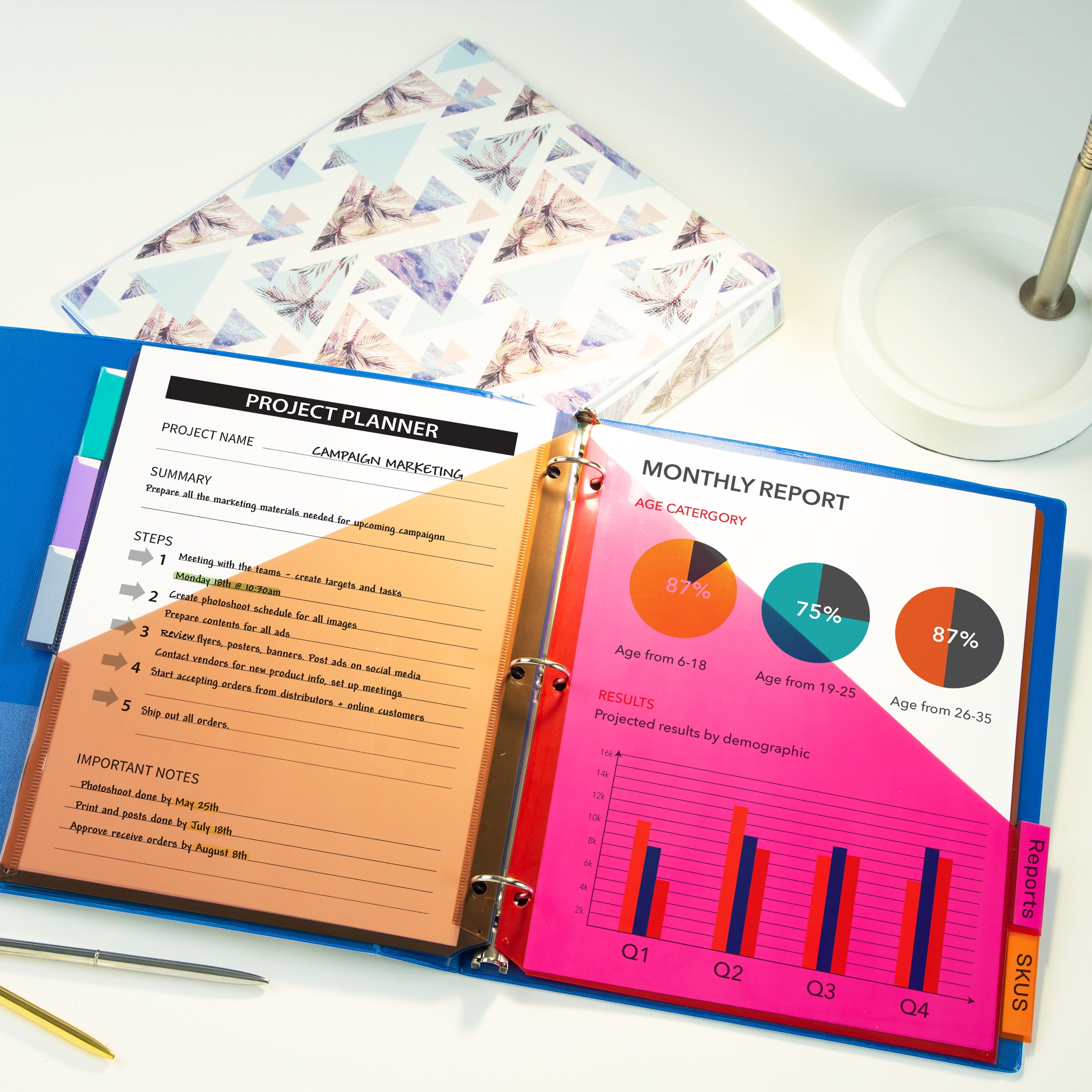 - Store loose papers and unpunched sheets within the front and back pocket of each 5-tab binder dividers