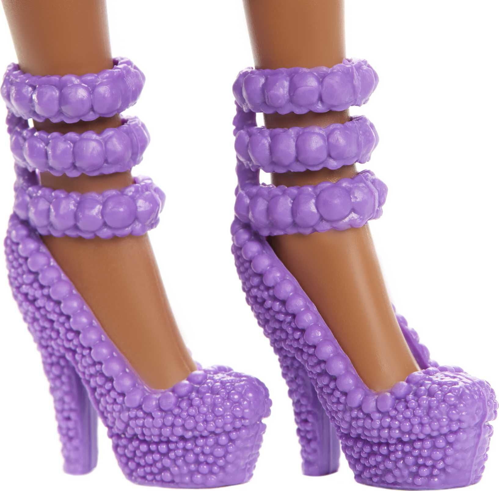 - Barbie doll wears a pink bodice decorated with purple bow and purple shimmery skirt