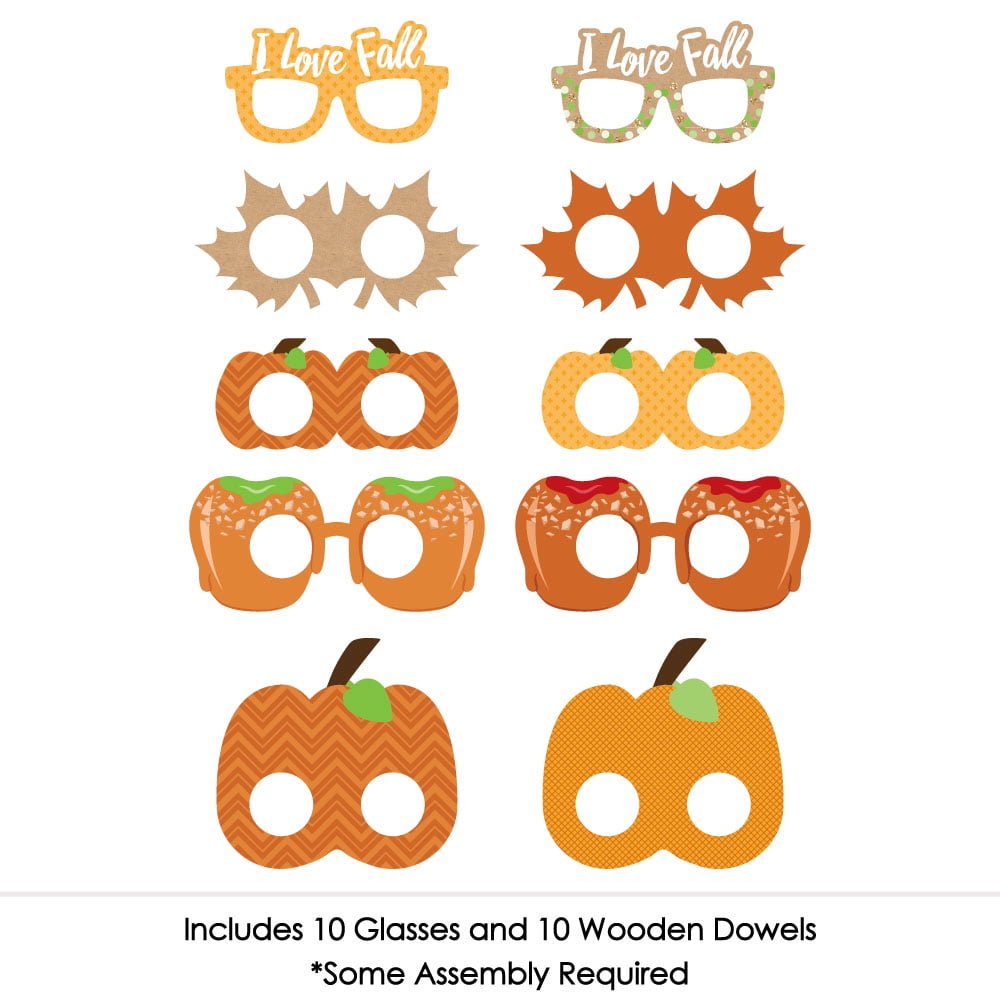 - 10-Piece Pumpkin Patch Photo Booth Props INCLUDES 10 fun photo autumn photo booth props to the wooden dowels sticks for assembly. EASY ASSEMBLY: Simply attach the printed Pumpkin Patch photo booth props to the wooden dowels with included reinforcing stickers.