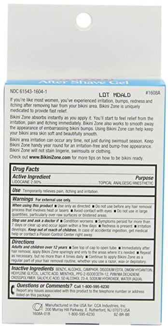 Medicated after shave gel, topical analgesic with lidocaine. Bikini Zone Medicated Gel is specially formulated to provide fast relief from the bumps, irritation, and pain that occurs in the sensitive bikini area after shaving, waxing, or depilating. Medicated to provide fast relief. Starts to provide relief from irritation, redness, pain, and itching immediately. Works to smooth away the appearance of embarrassing bumps.