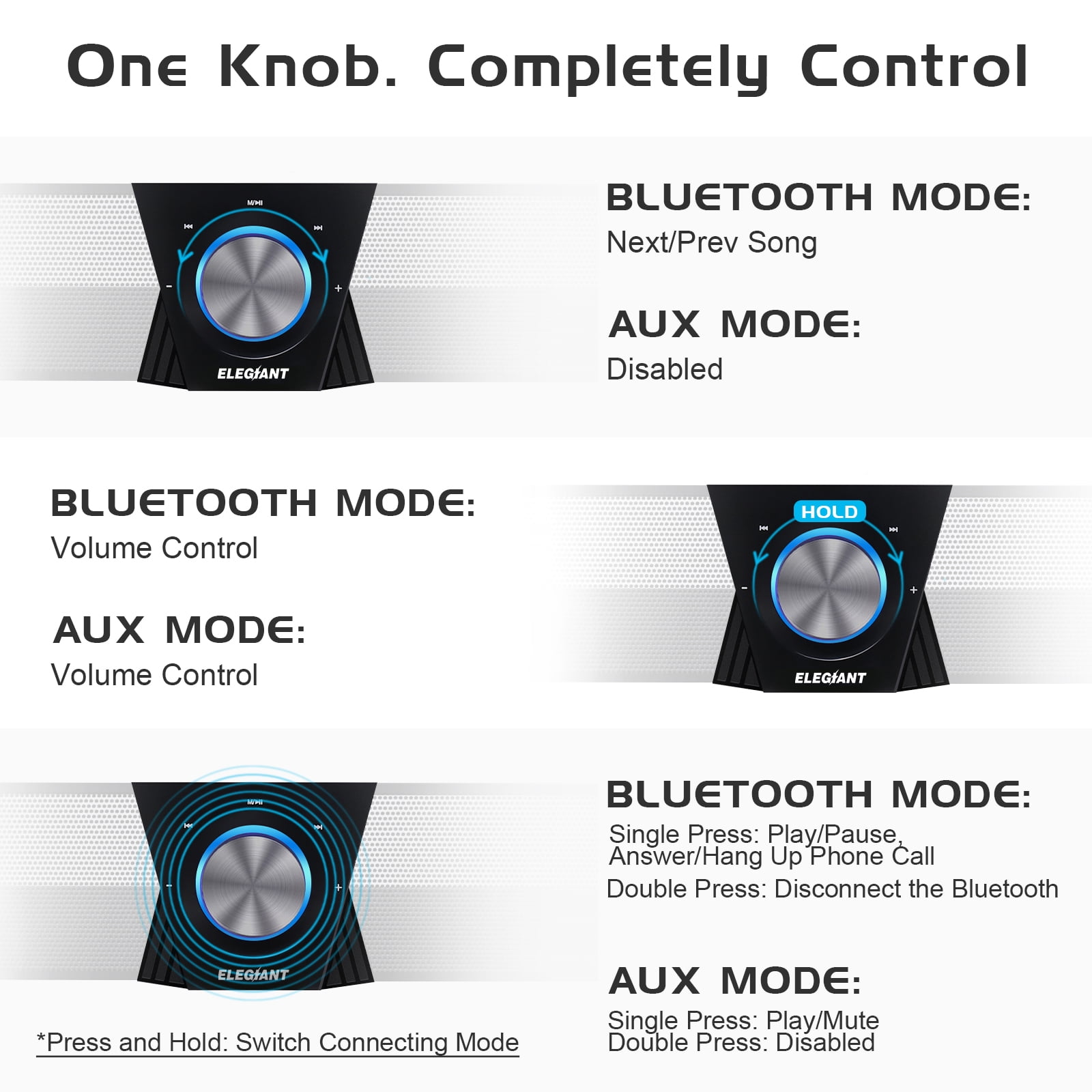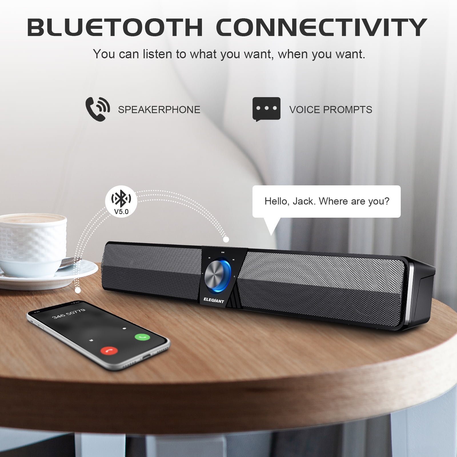 2*10W computer speakers and Bluetooth 5.0 chipset, greater bass and excellent sound performance. ELEGIANT-SR500 wireless soundbar supports most currently popular Bluetooth profiles such as A2DP / AVRCP for audio streaming transmission and HSP / HFP for hands-free, quickly establish a stable connection with most Bluetooth devices. The audio will be distortion-free in the transmission process or telephone call, even if at maximum volume. 3.5mm Aux-in audio interface makes it suitable for any device that has an audio output. In addition, the speaker can read music from TF card and USB stick and play. Built-in mic, when your phone coming a call, you can simply press the button to answer the call(BT mode). One button to control all function you need: change the connected mode, volume, play the next/ previous song. With the 1800mAh built-in battery, the speaker can play music for 8H when it is fully charged. Just enjoy the music without needing to worry the battery. Also, there is a LED light surrounding the button which makes the portable speaker looks more elegant. Metal mesh effectively prevent music distortion and block external noise. In order to get a better experience please make sure it battery is not lower than 30%. Also, please feel free to contact us if you have any questions or advise to the product as this one comes with 18 month warranty and life-long consult service.