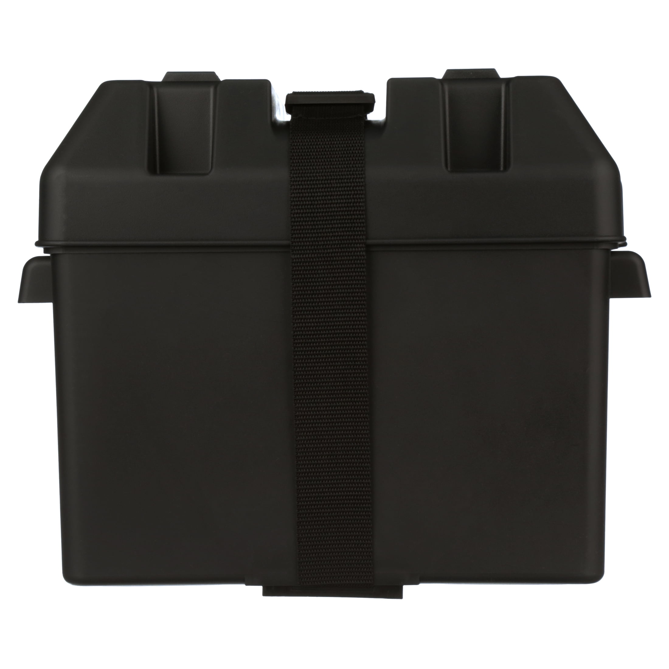 Camco RV Large Battery Box is a black lightweight, heavy-duty corrosion-resistant polypropylene box which is designed to secure and protect your battery. It includes lift-off lid, durable woven hold-down strap, foot clamps and stainless steel screws. This box meets USCG CFR 183.420 and ABYC E-010.7 specifications. It fits group size 27, 30, and 31 batteries with inside dimensions measuring 7 ¼” Wide X 13 ¼” Long X 8 5/8” tall with 2” additional head room for battery terminals. Model#: 55372.