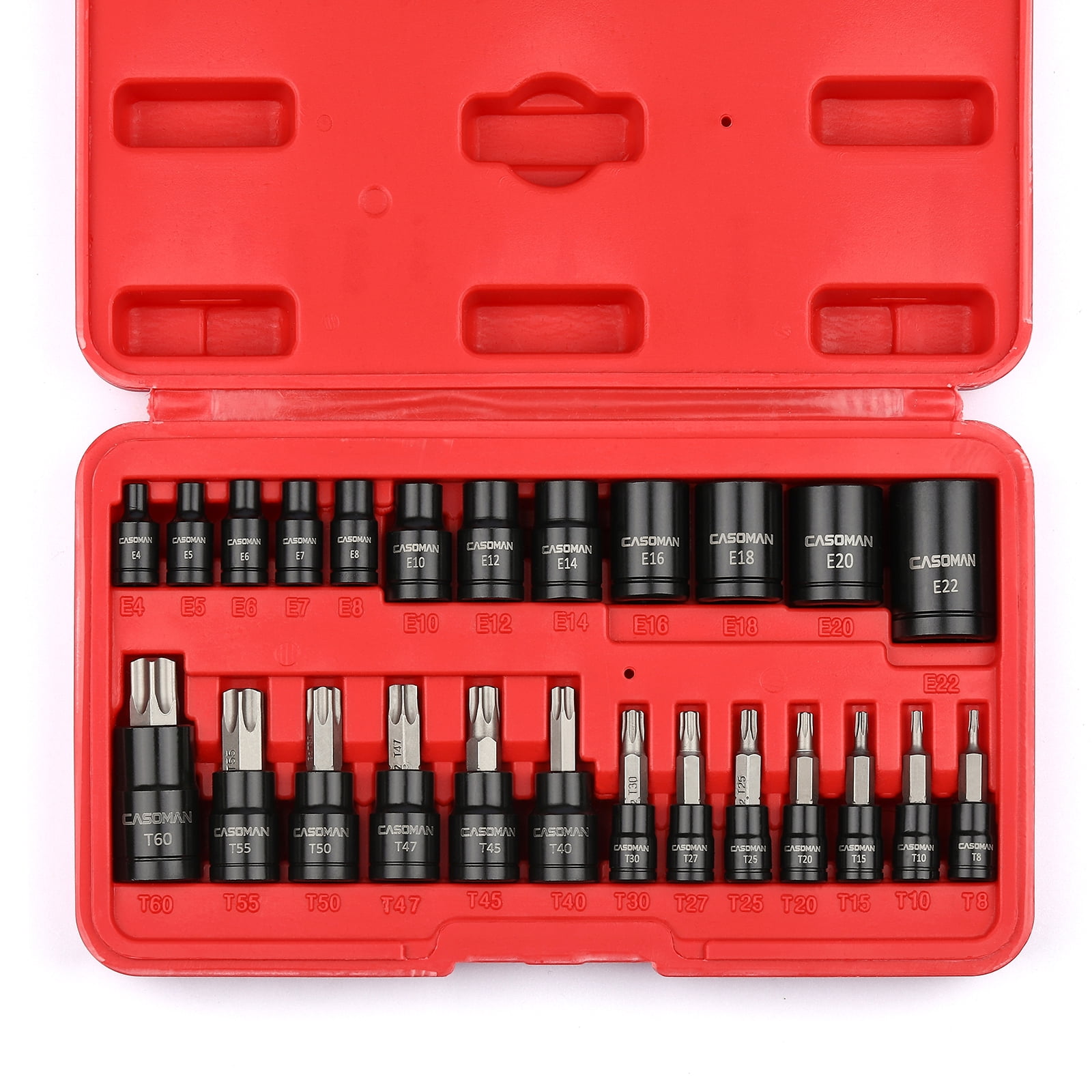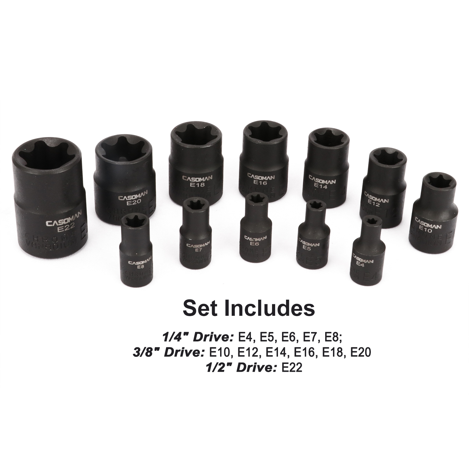 - Set includes: 12 Female E-Torx Sockets: 1/4" Drive: E4, E5, E6, E7, E8; 3/8” Drive: E10, E12, E14, E16, E18, E20 1/2” Drive: E22
