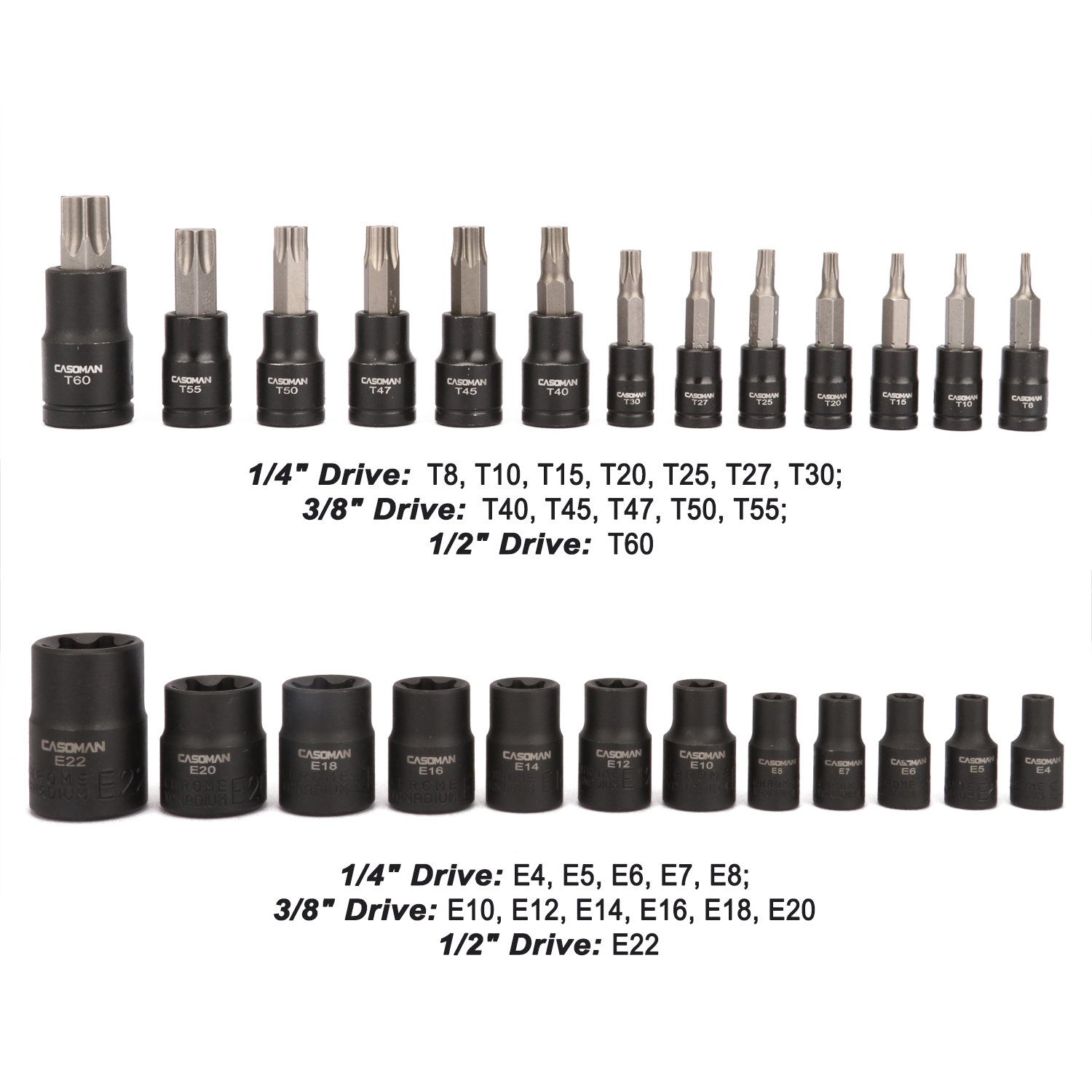 - Set includes: 13 Star Socket Bits 1/4" Drive: T8, T10, T15, T20, T25, T27, T30; 3/8" Drive: T40, T45, T47, T50, T55; 1/2" Drive: T60