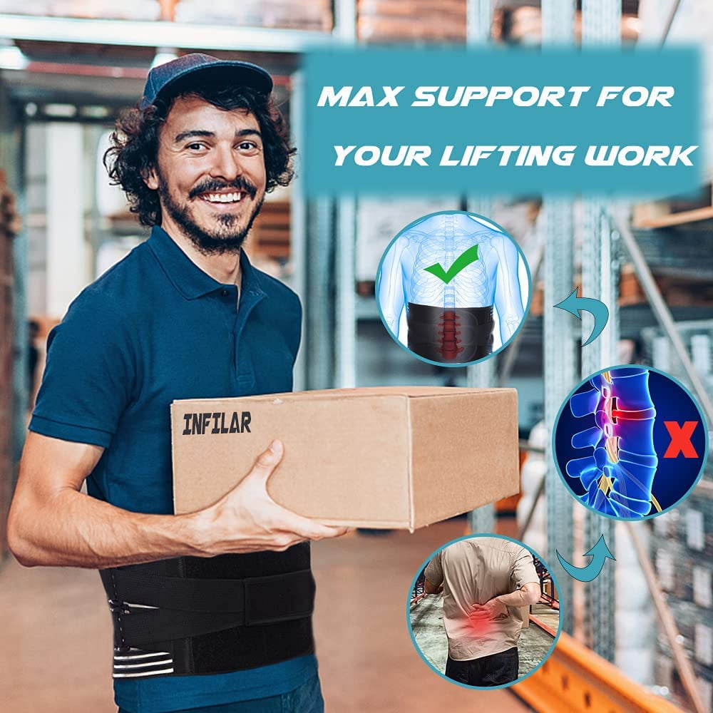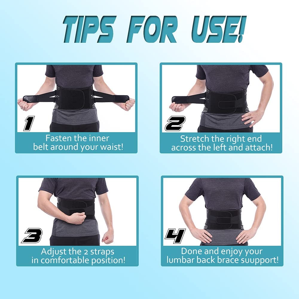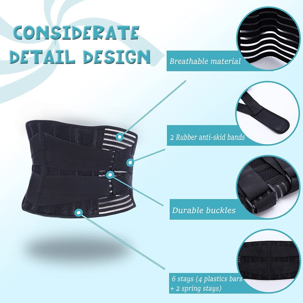 - SPECIAL SUPPORT – Back brace contains 4 Memory-aluminum stays used PP strips,and 2 steel springs placed along the waist side, offer 360° stronger vertical support to lower back. It can prevent back injuries from weight lifting, long time standing or sitting, doing housework, working, etc.