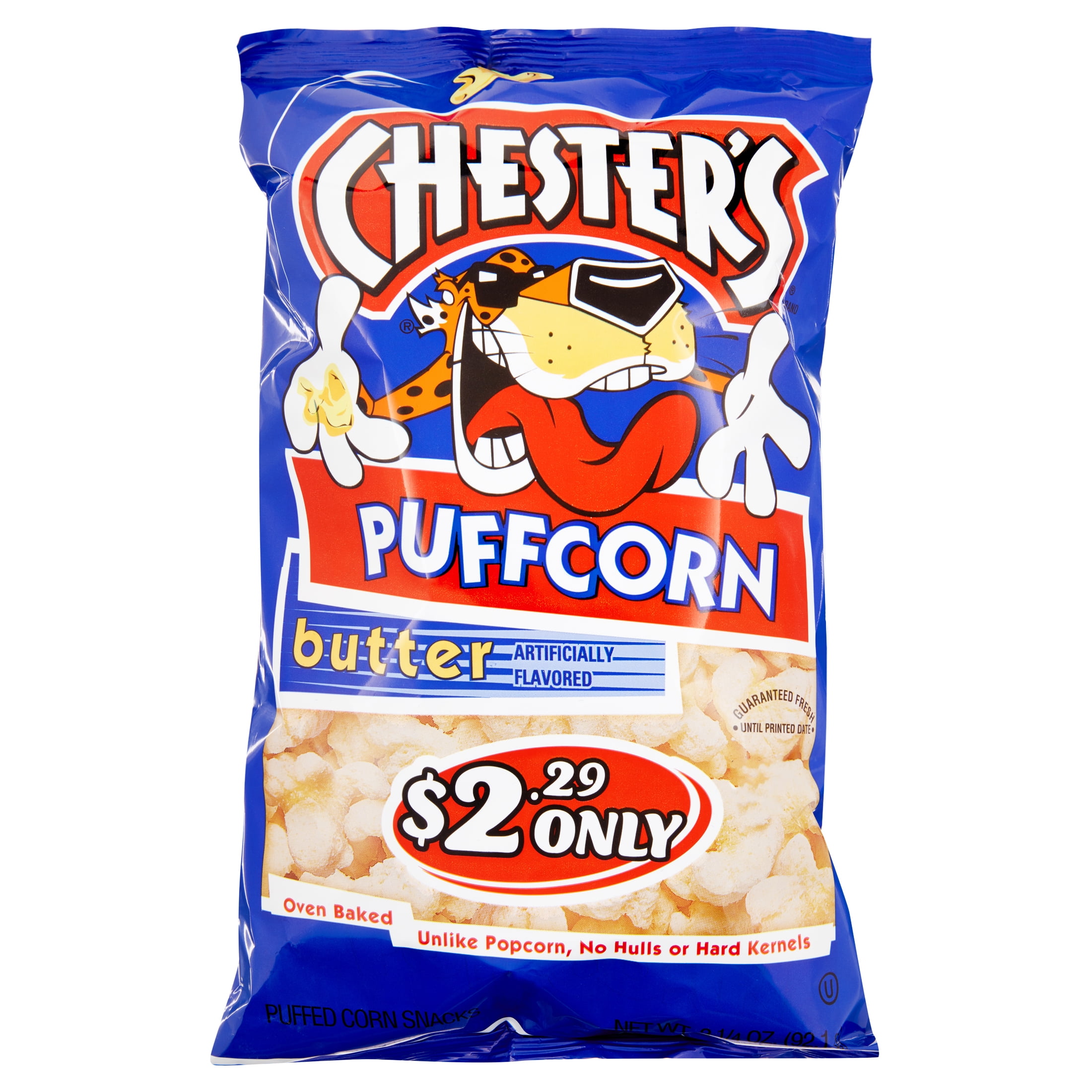 When Chester Cheetah puts his name on a snack, you can count on a bold and cheesy flavor like you’ve never tasted. CHESTER’S snacks are made with a special blend of real cheese seasoning to give each bite the perfect pop and zing. CHESTER’S Butter Flavored Puffcorn Snacks are perfect for sharing with family and friends. Oven baked and unlike popcorn, there are no hard kernels.
