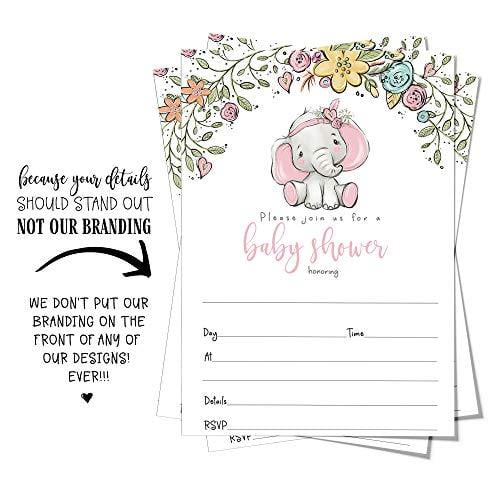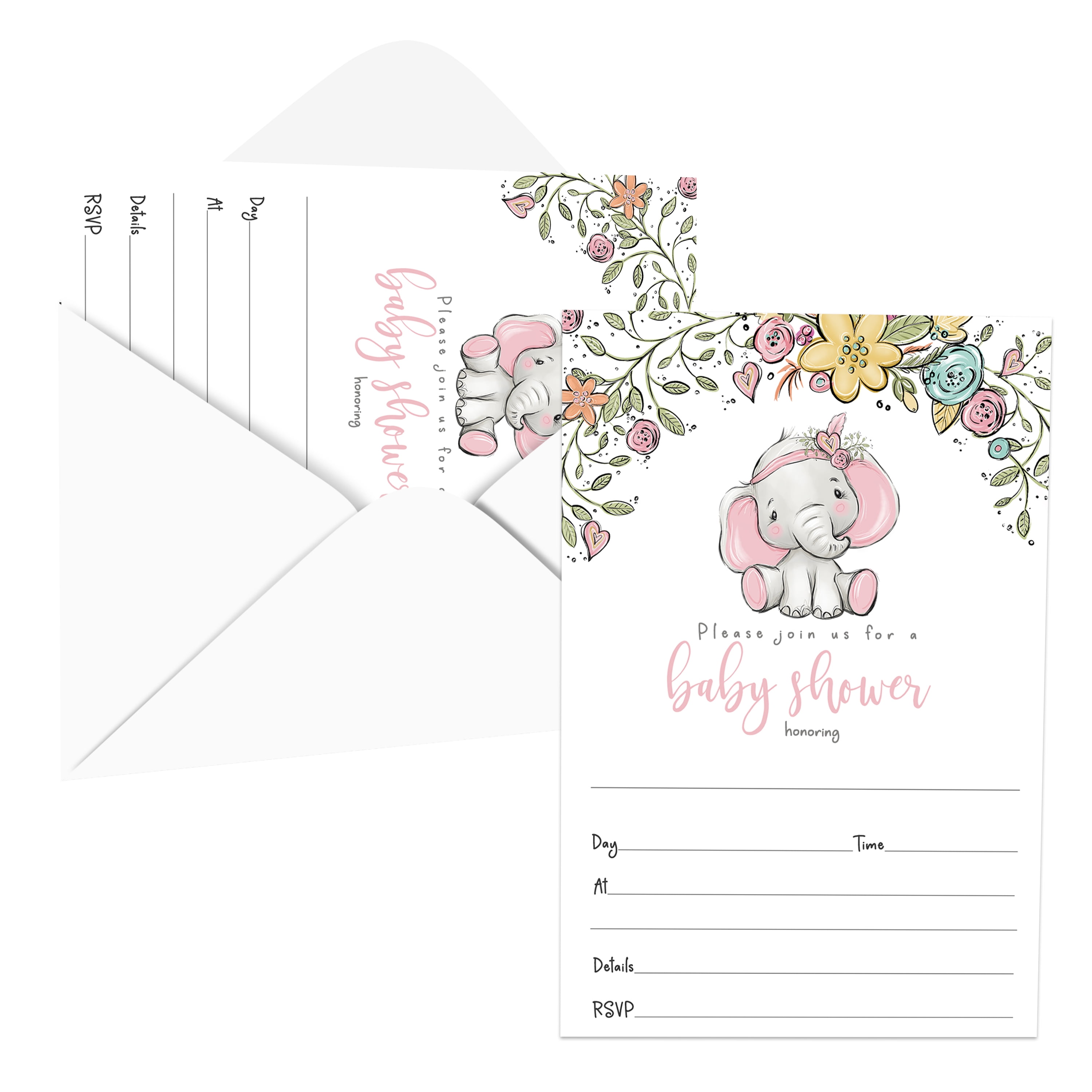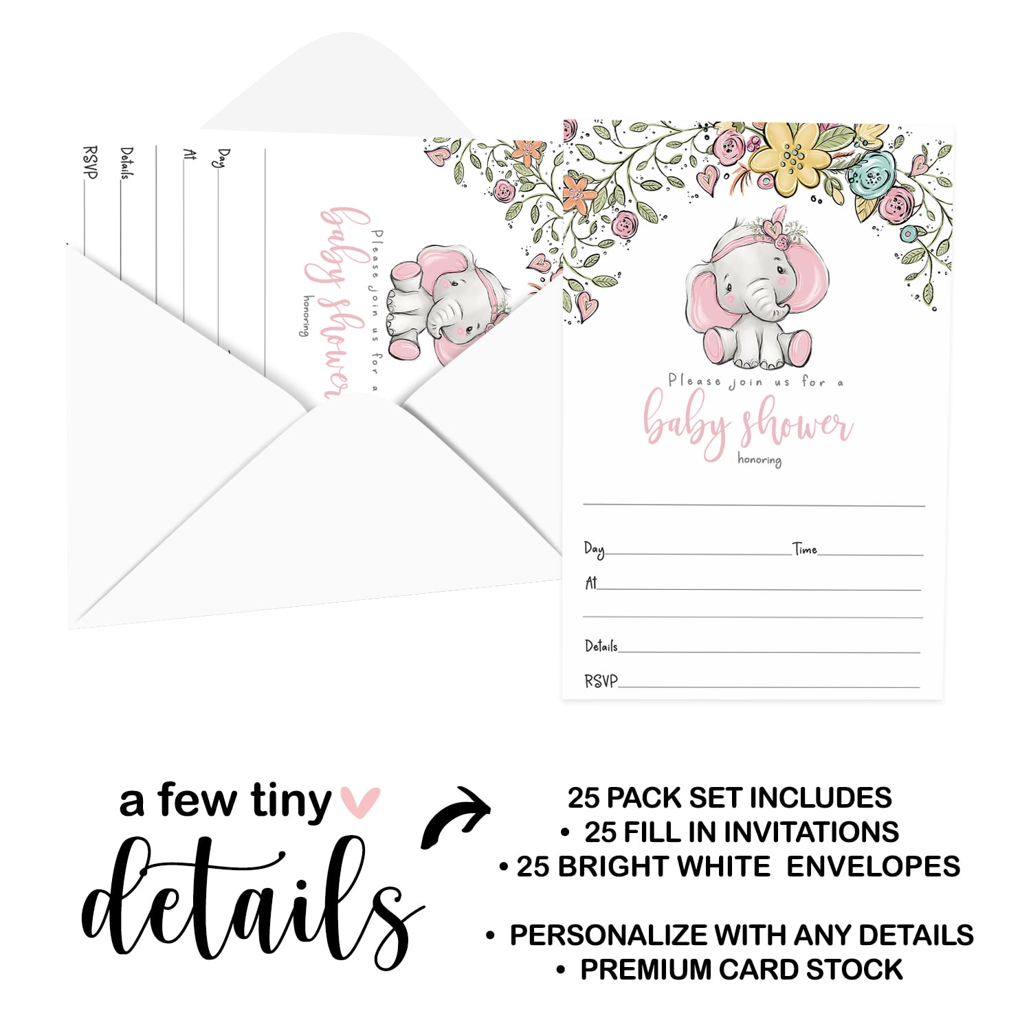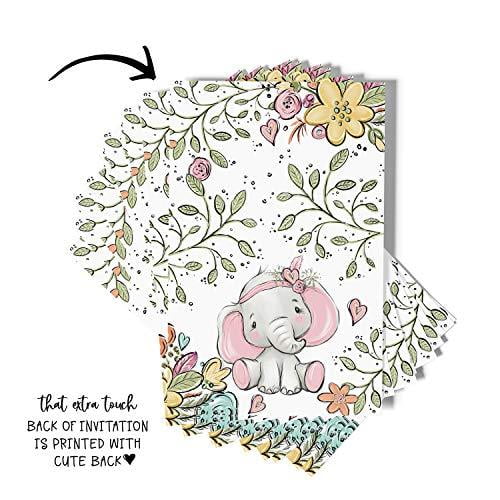 Cottage Elephant Baby Shower Invitations with Envelopes Pack of 25 Blank Invites Girls Floral and Greenery Pink Event Theme Printed Card Set Paper Clever Party