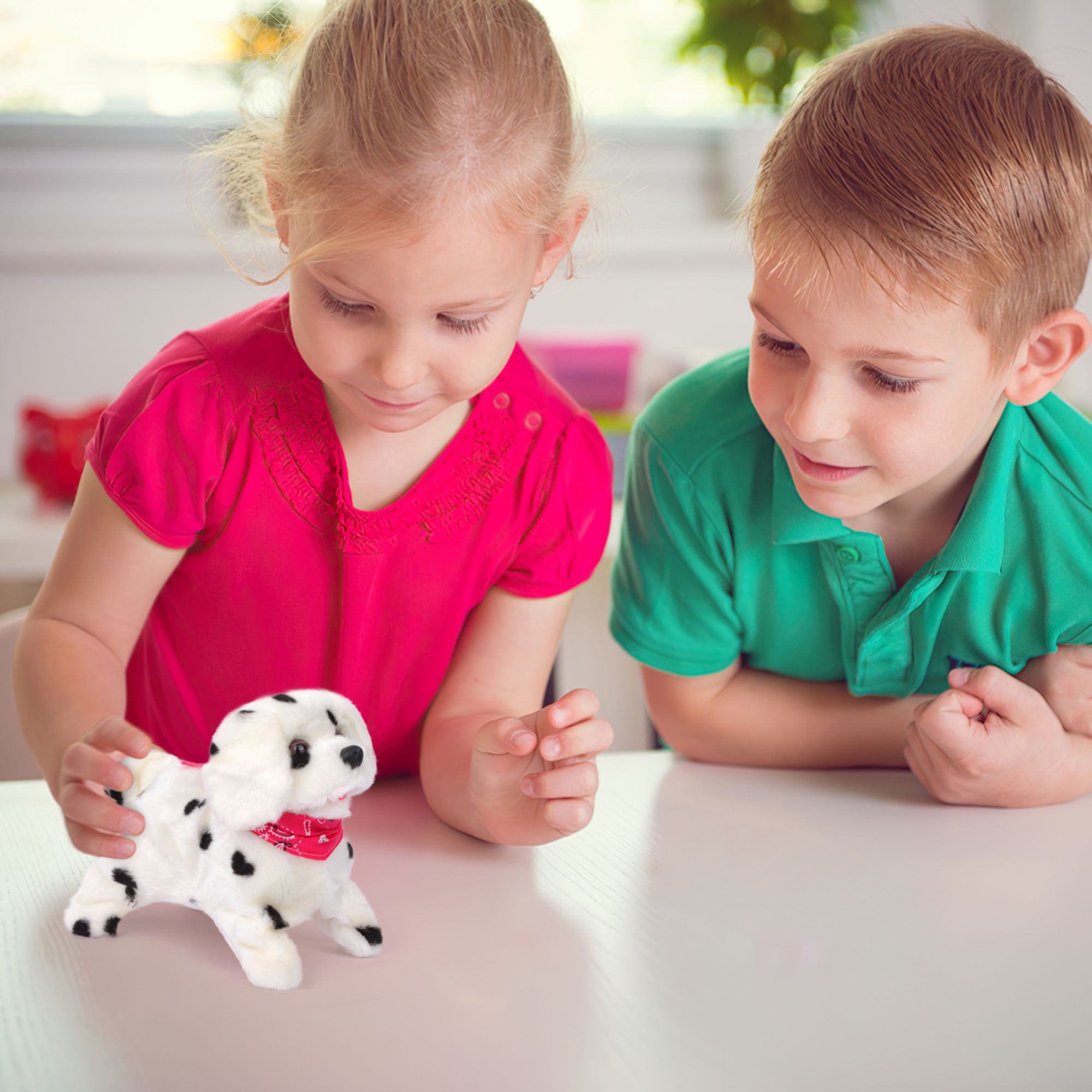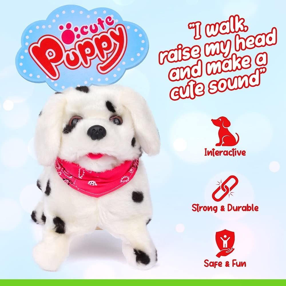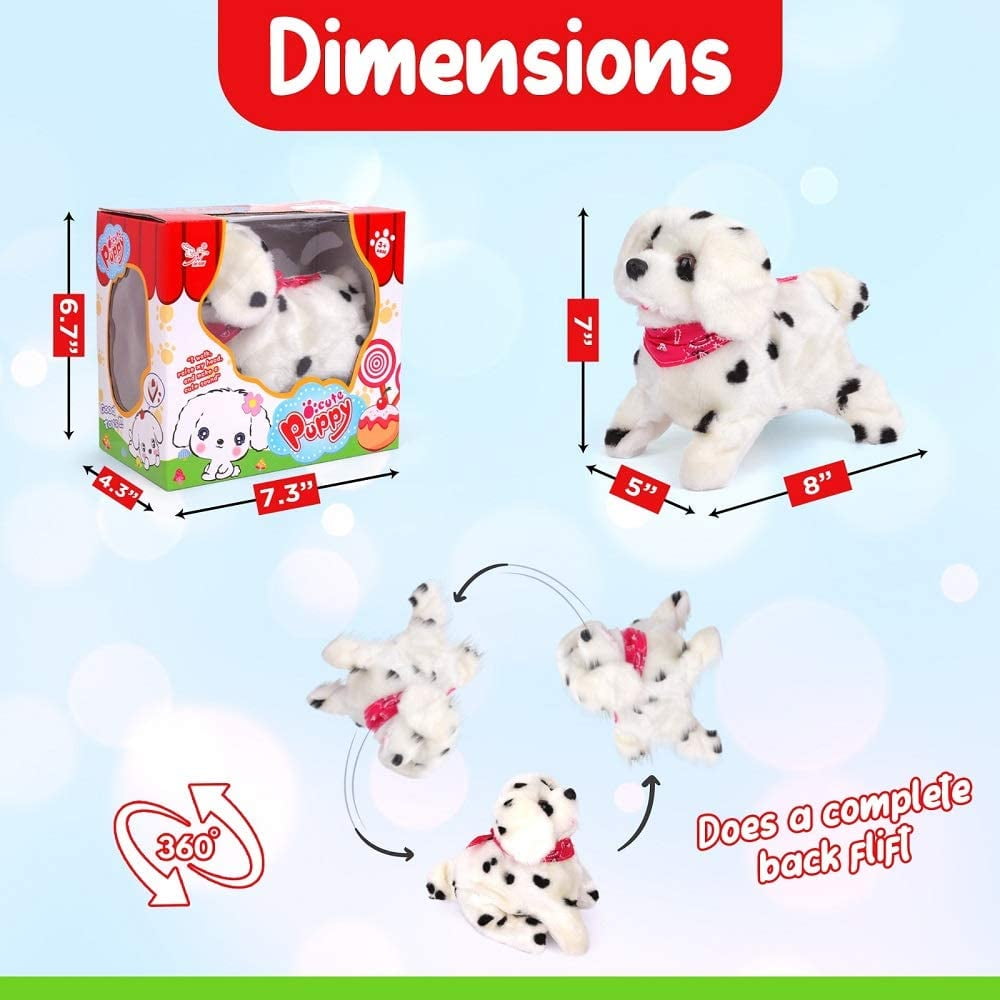 Easy to operate: The little puppy toy is simple and easy to operate. No technicalities required. You simply need to put in the batteries and switch it on.Automatic Walking Forward And Backward ,âï¸ Lightweight: The small barking puppy weighs only 8 ounces so easy for children to play with.âï¸ Made for toddlers: This little wagging animal is safe for children of 3 Years of age and above.âï¸ Detailed instructions: The box contains details instructions about how to put batteries and then use it.âï¸ 100% Satisfaction Guaranteed: Our toy dog is made from premium quality material and hence 100% guaranteed! In case you face any issue just let us know and we will resolve it as soon as possible. Recommended Age: 3+YearsCute Somersault Little Puppy – Barks, Sits, Walk, Comes with a cute bandana accessory on the dog
