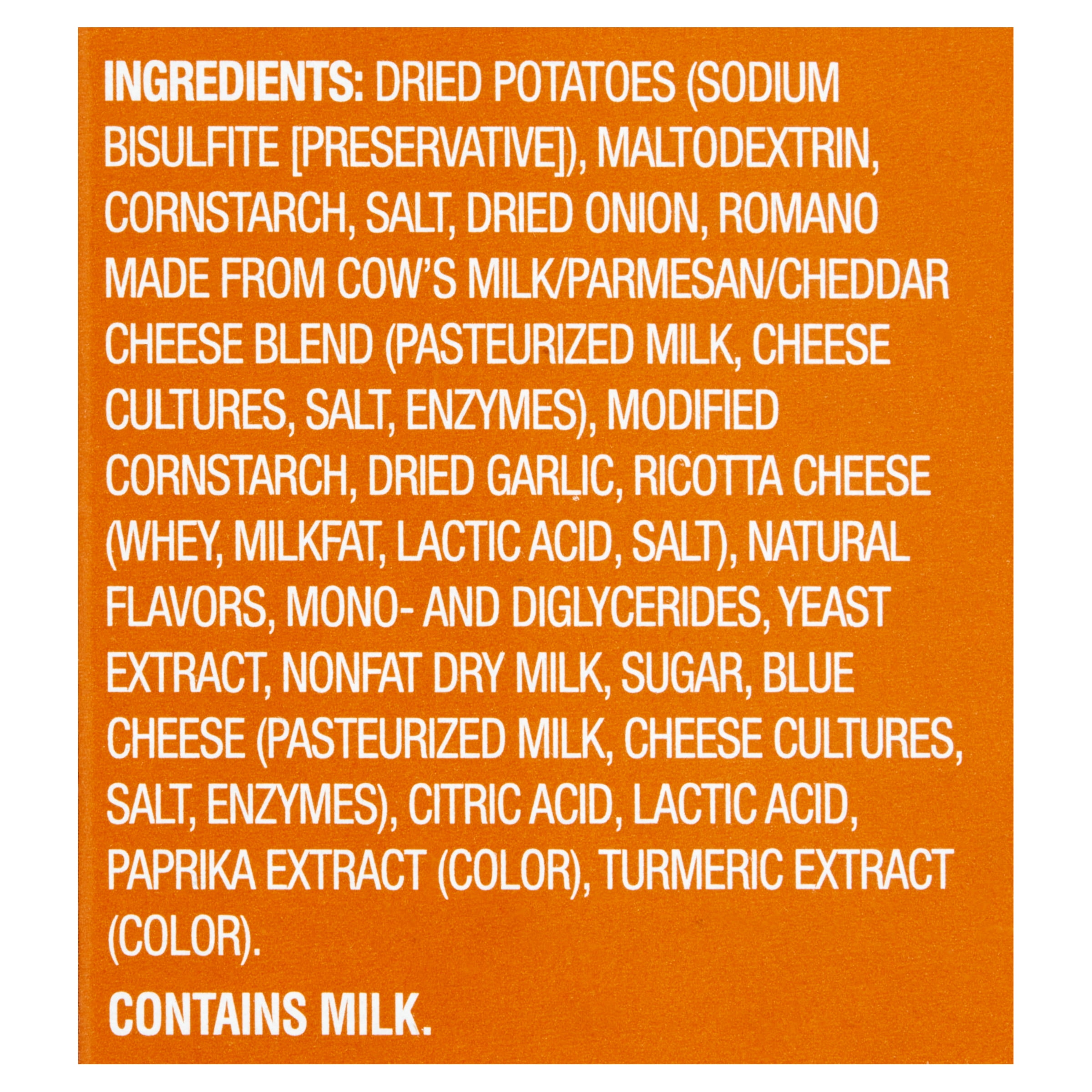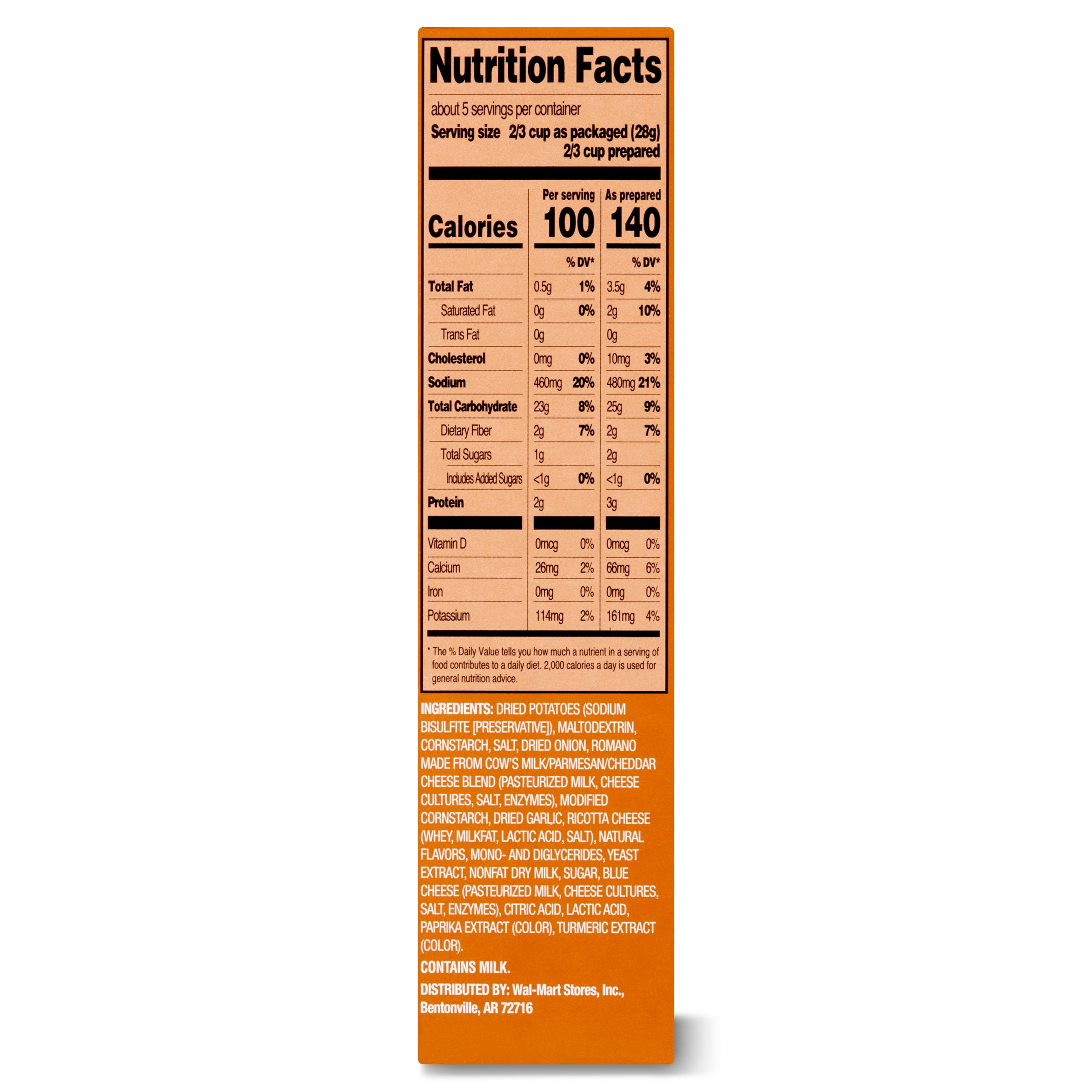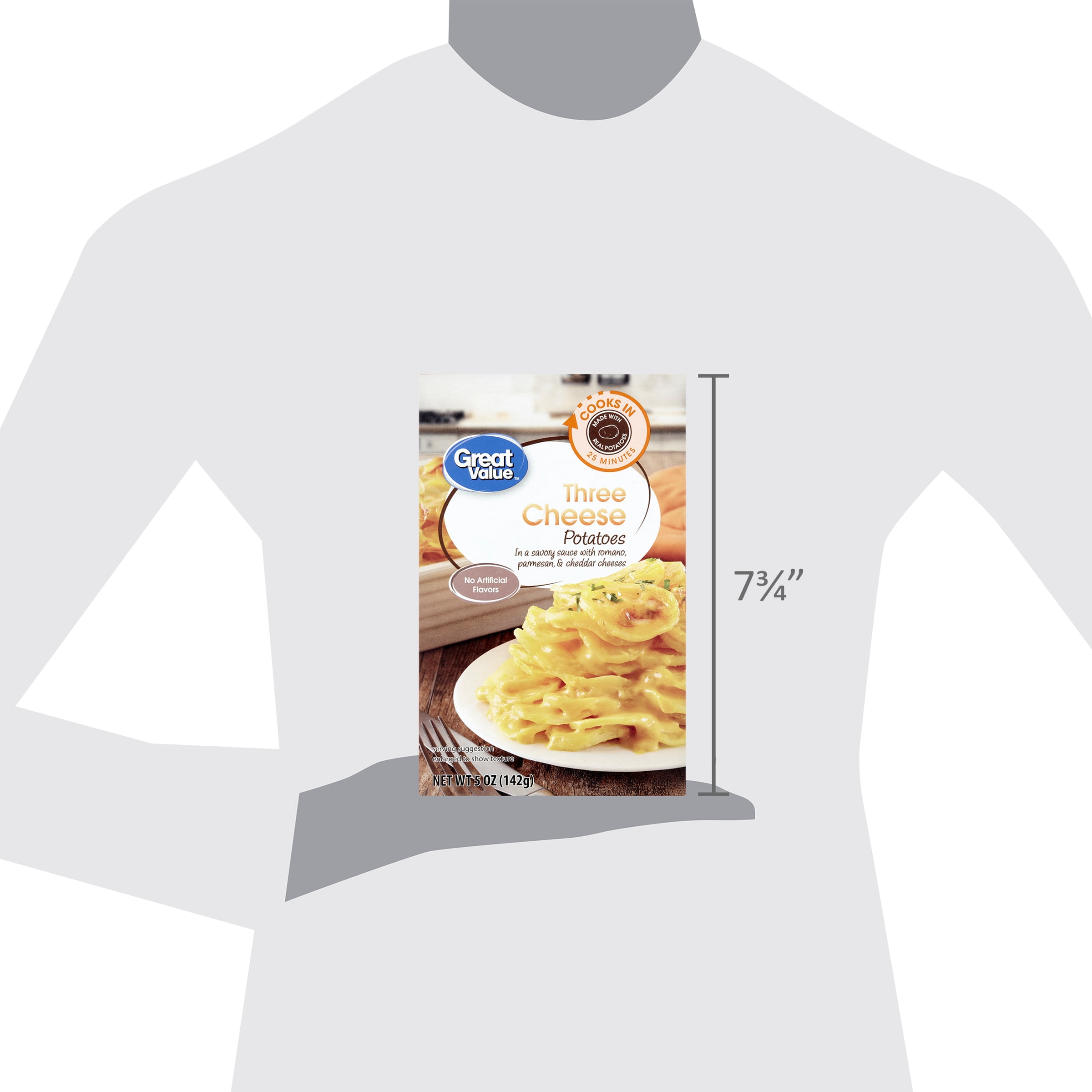 Great Value Three Cheese Potatoes are 100% real potatoes in a savory sauce with romano, parmesan, and cheddar cheeses. Conveniently packaged and easy to make, it bakes up in 25 minutes. Simply add margarine or butter, and milk, and bake. Every bite of this creamy, cheesy casserole is packed with everyone’s favorite flavor. It’s perfect as a side but also makes a delicious main dish. Serve it with grilled fish, chicken, or beef for a mouth-watering and satisfying meal. Add buffalo chicken or savory ground beef for a casserole of comfort food at its finest. Healthy and nutritious, there are no artificial flavors or trans fats. Our three-cheese casserole is perfect to have on hand in your pantry. Make your busy life a little easier and serve a flavorful dish your family will enjoy with Great Value Three Cheese Potatoes.