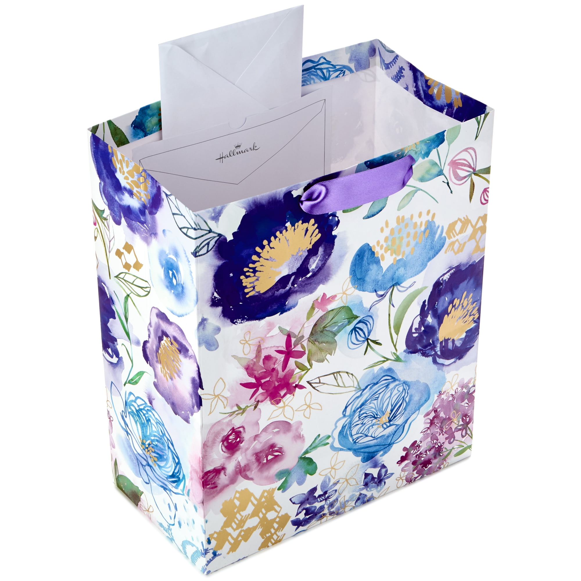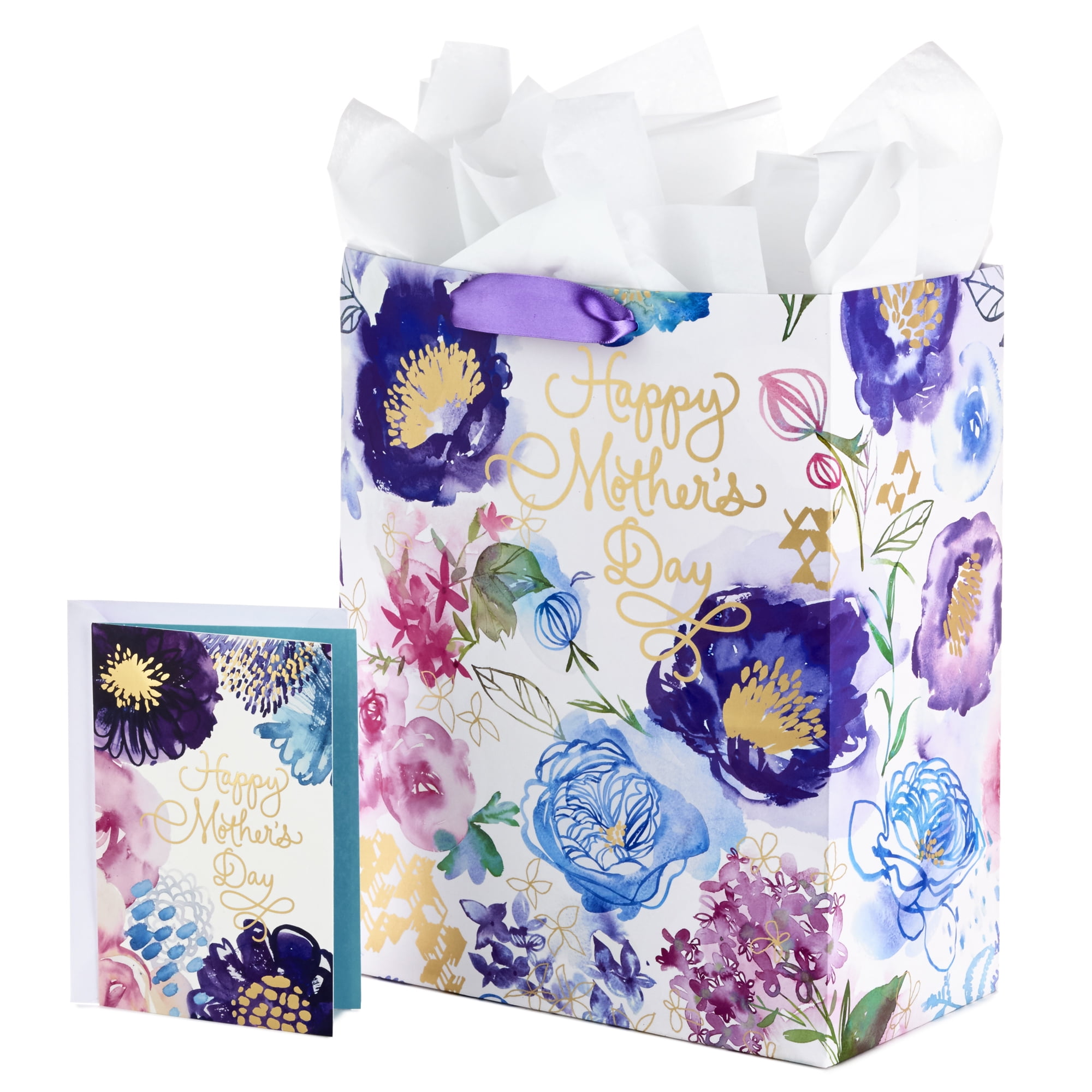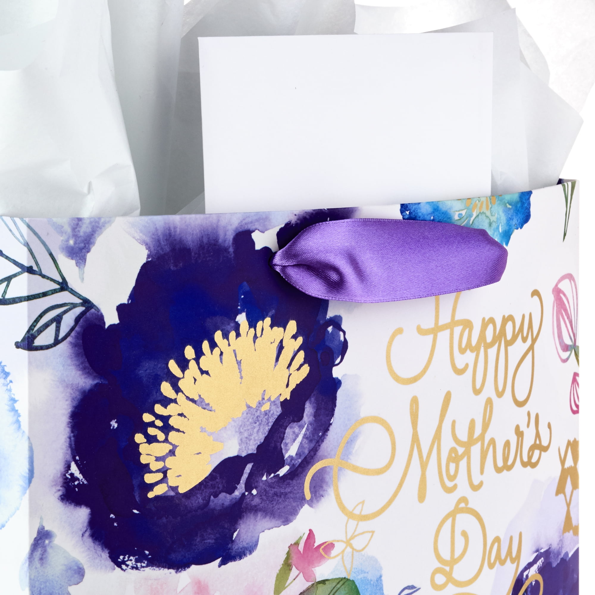 - Mother’s Day gift bag features a watercolor flower design with gold foil lettering. Satin ribbon handles, a Mother’s Day card, and three sheets of white tissue paper complete the package