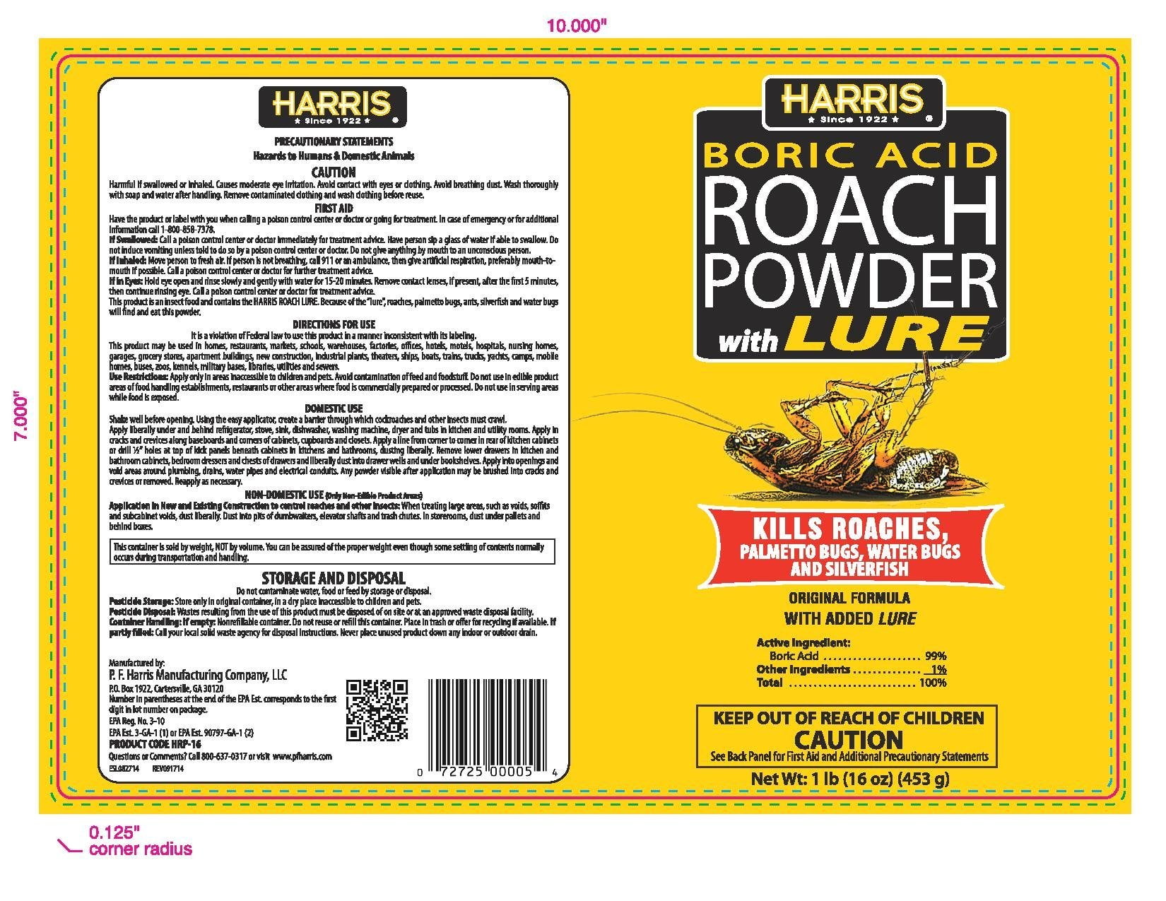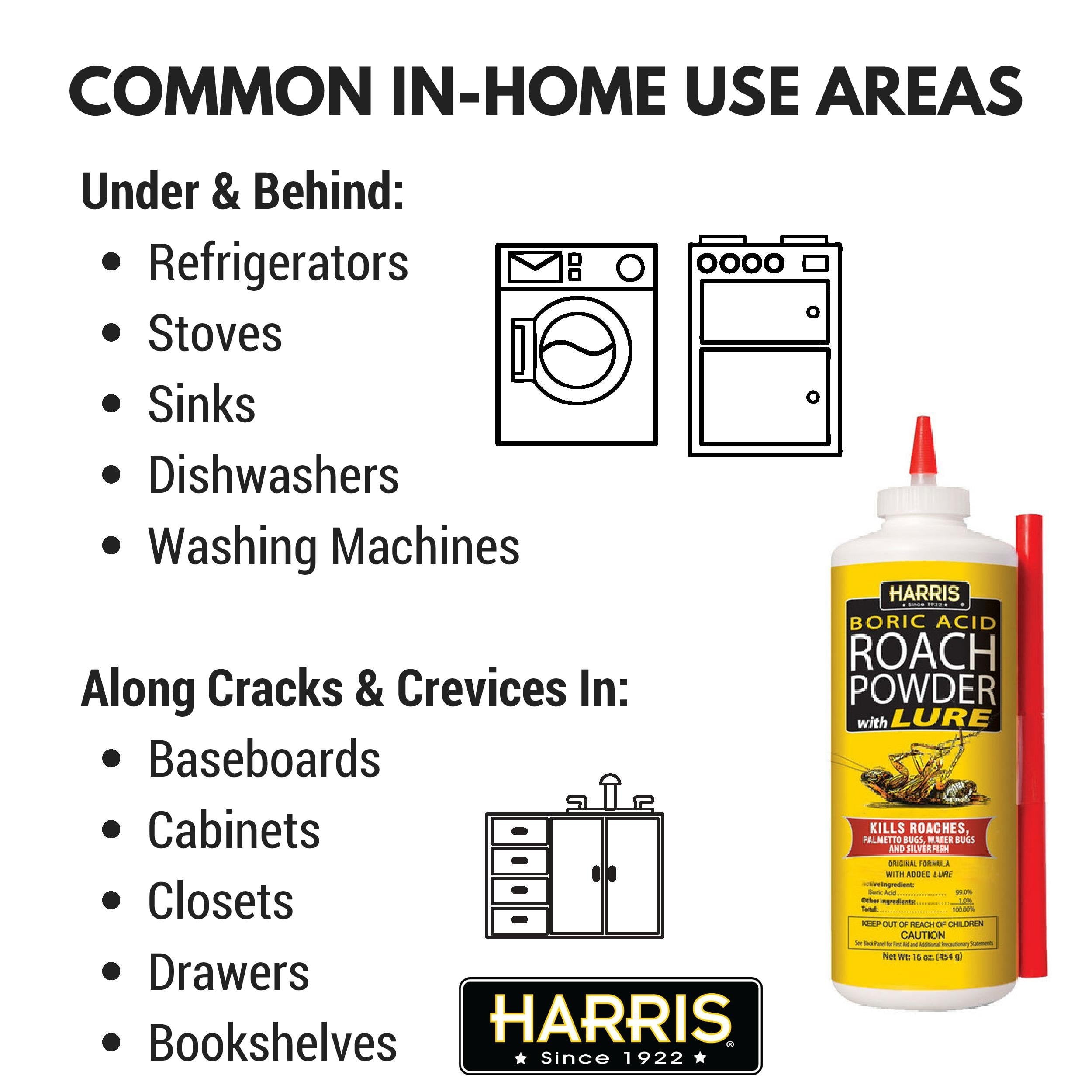 Harris Products Group was so successful in eliminating the scourge that he was described on the front page of the Washington Times as a "vermin slayer "who has just fought a decisive, winning battle with a horde of cockroaches which infested the lower regions of the Executive Mansion. Over the course of the next few months Harris took “his final feast” to dozens of government buildings, including the Senate Office Building, the Department of Justice, the Supreme Court and Walter Reed Hospital. Success followed success: Each superintendent of the various buildings was highly satisfied with the results. The company today stays nimble enough to respond to changing market demands, leading the way in the development of numerous products, including natural insect repellents like Swamp Gator and Swamp Gnat which repel biting insects without using deet. Beyond the products it sells, Harris helps customers find easy and economical solutions to pest problems through helpful labeling, instructive videos and personal advice. It’s a brand with a reliable past and an innovative future. PF Harris is America’s oldest EPA-registered company. With more than 55 products, the company provides solutions to treat everything from roaches and bed bugs to scorpions and stink bugs. Using Harris Boric AcidRoach Powder Shake well before opening. Using the easy applicator, create a barrier through which cockroaches and other insects must crawl. Puff a light dusting of powder in areas such as behind refrigerators, along baseboards and in cracks and crevices where roaches have been seen. The powder contains alure that roaches will seek out. Take measures to ensure that the powder is kept dry in order to remain effective. Boric Acid works by interfering with the roach’s digestive system. In addition, the powder will cling to the outside of the roach, helping to kill other roaches when the affected roach returns to the colony. The powder is fast acting; insects coming into contact with the boric acid will die within 72 hours. Eliminate and Prevent Roaches Eliminate Liquid insecticides can be used to treat in and around the infested harborages in kitchens and bathrooms. Treat along and behind baseboards and into cracks and crevices on counters as well as under sinks. Use boric acid roach tablets in hard to reach areas under sinks, and behind refrigerators and other kitchen appliances. Roach powder can also be used behind baseboards and in locations not easily treated with liquid insecticide. Sticky traps can be used to control infestations. Place these traps next to baseboards for optimal effectiveness. Prevent Removing excess food scraps and limiting the availability of water in sites that are infested with cockroaches will help control these pests. Be sure to clean up spills and crumbs right away and avoid leaving food out in the open for extended periods. Seal any cracks and openings with caulk.