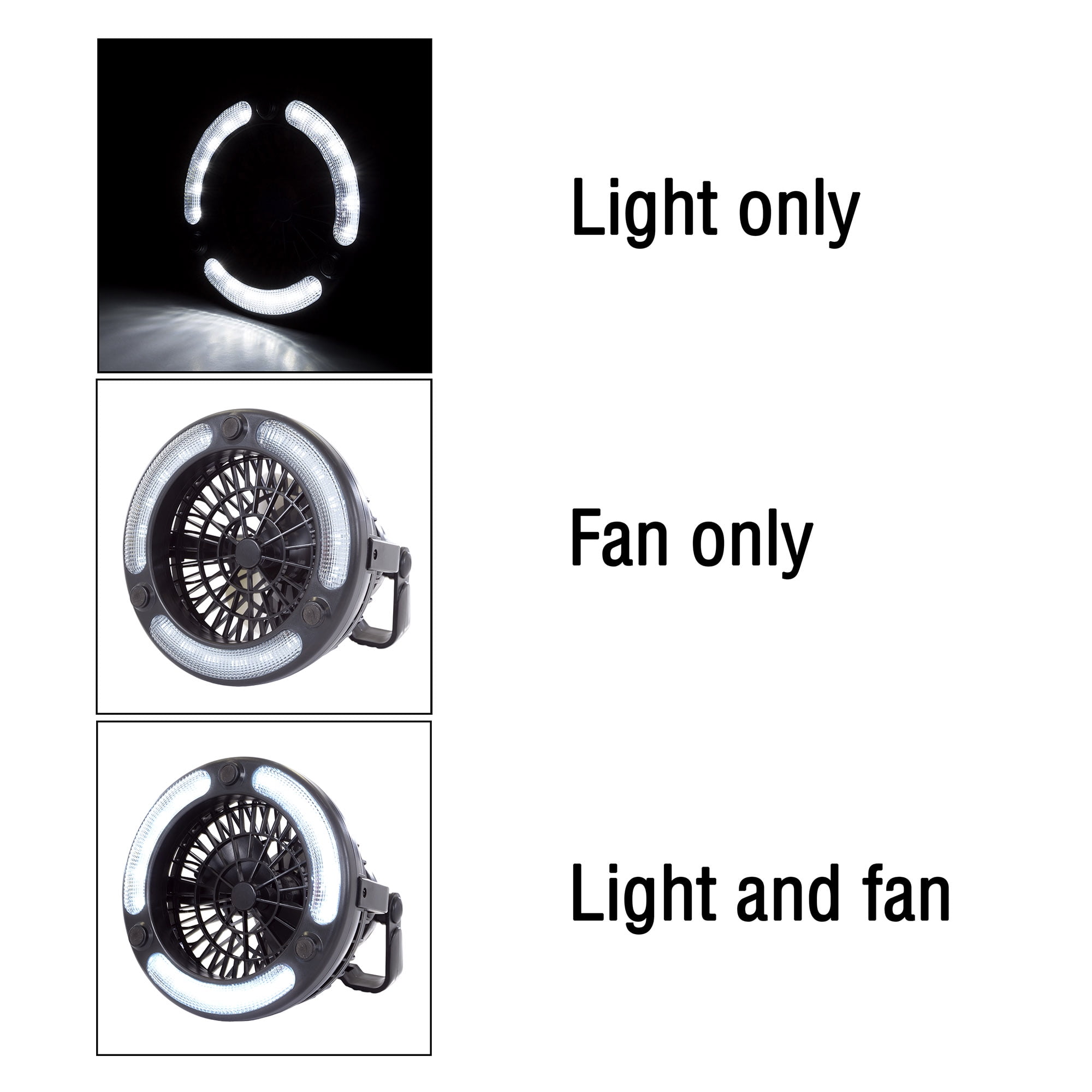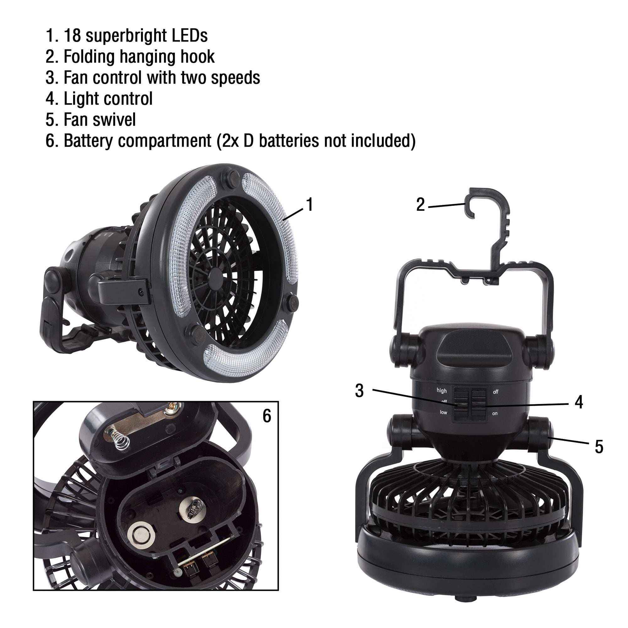 - BRIGHT ILLUMINATION – Depend on the 18 LED bulbs in this camping light with ceiling fan to provide bright illumination. The lamp moves 360 degrees around the fan, so you can focus light where you need it, and a toggle switch ensures easy on/off operation.