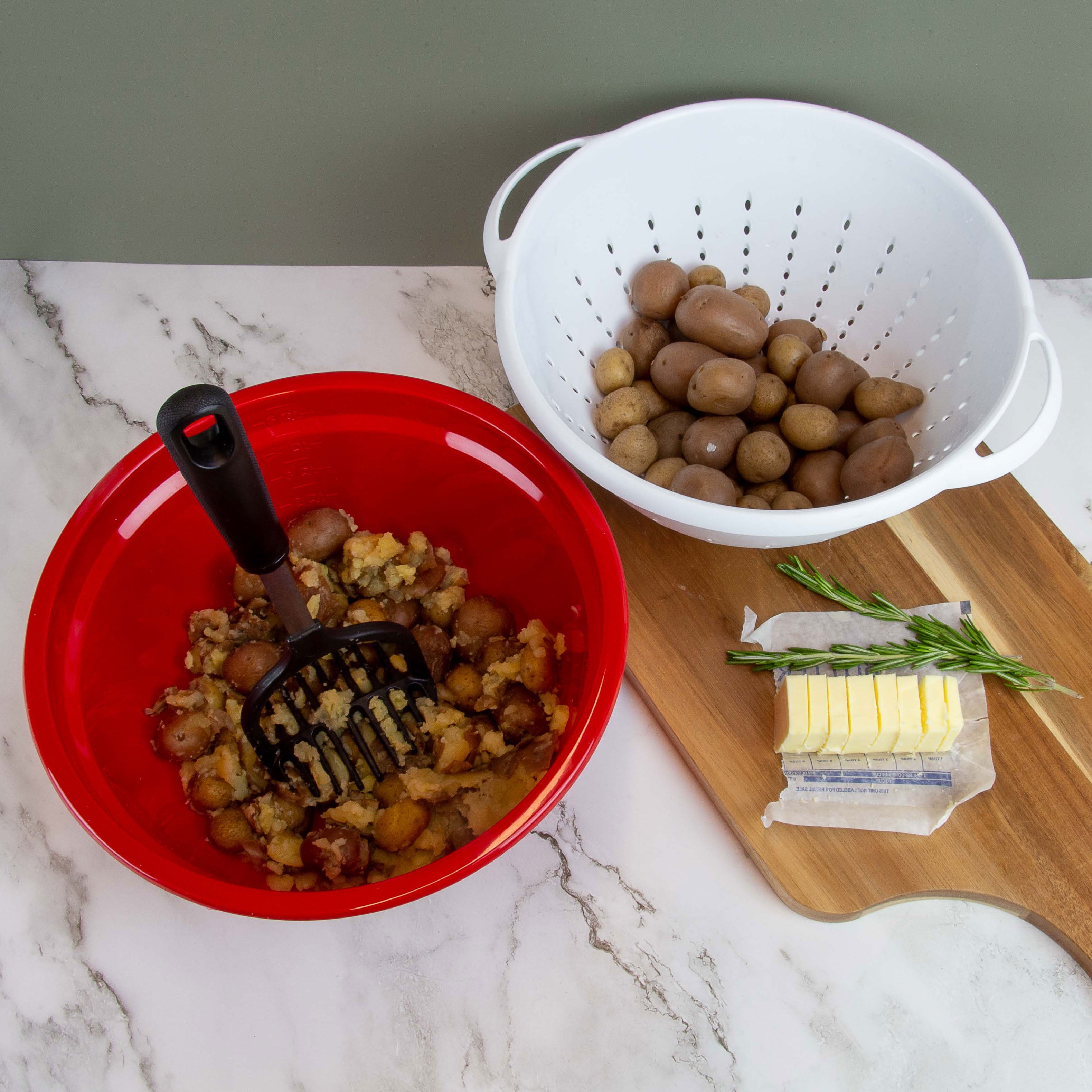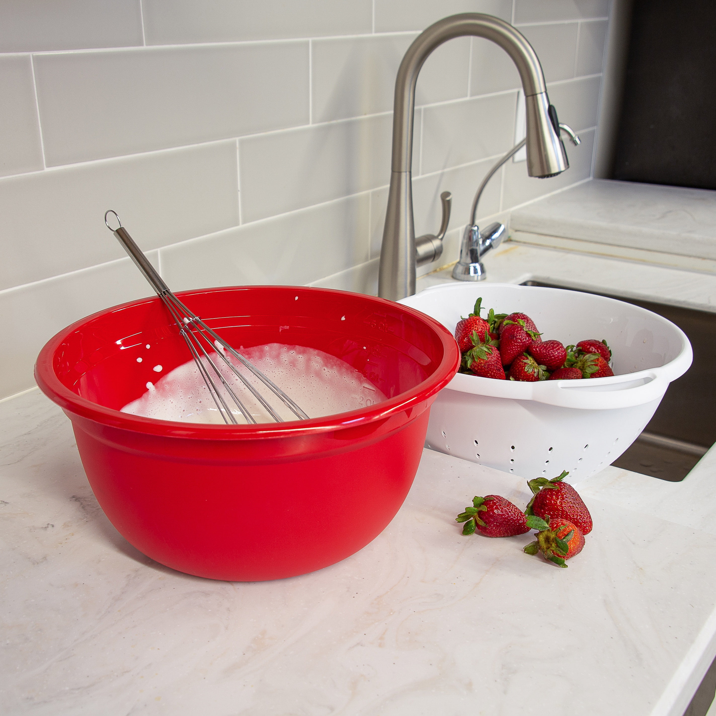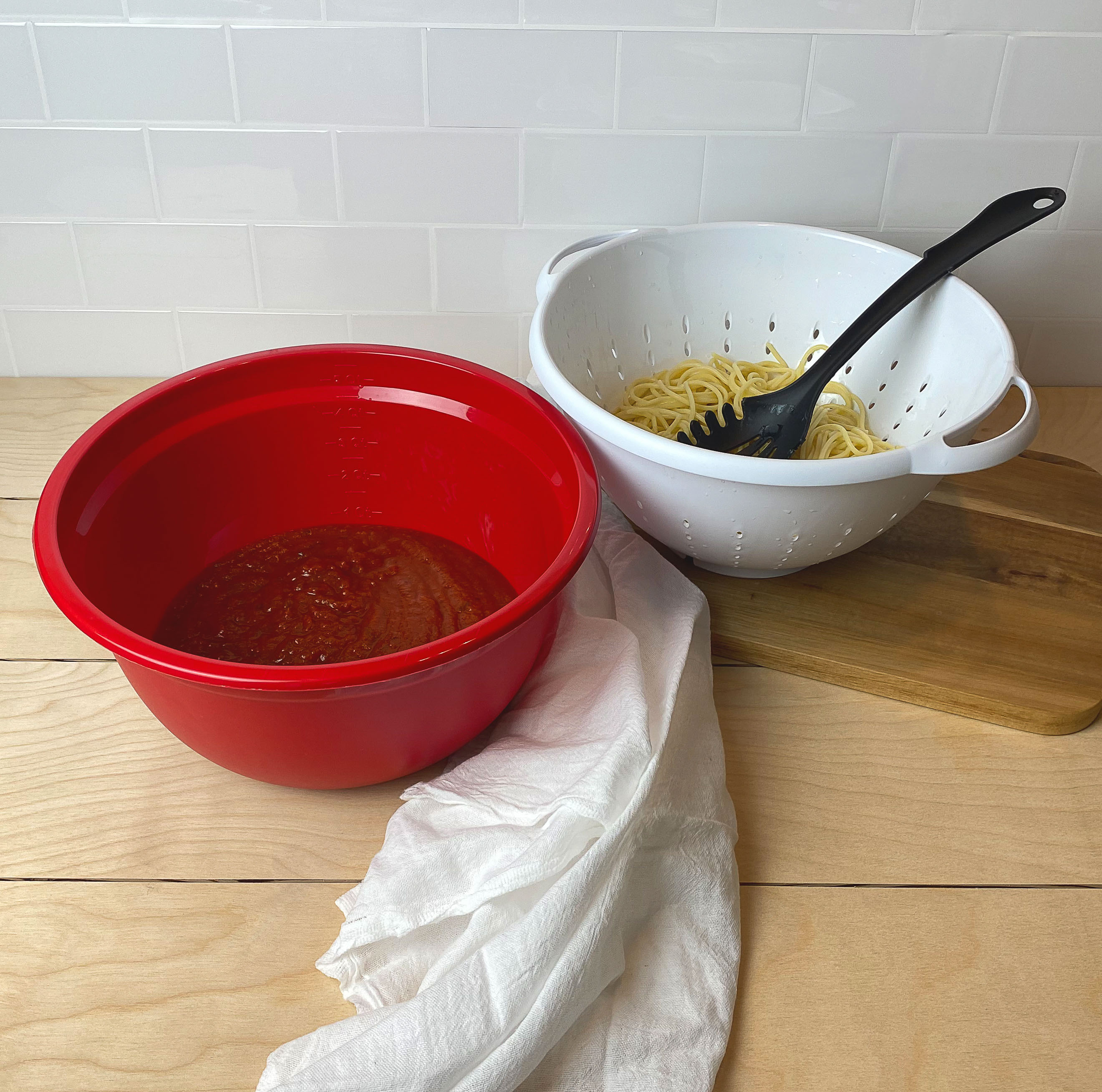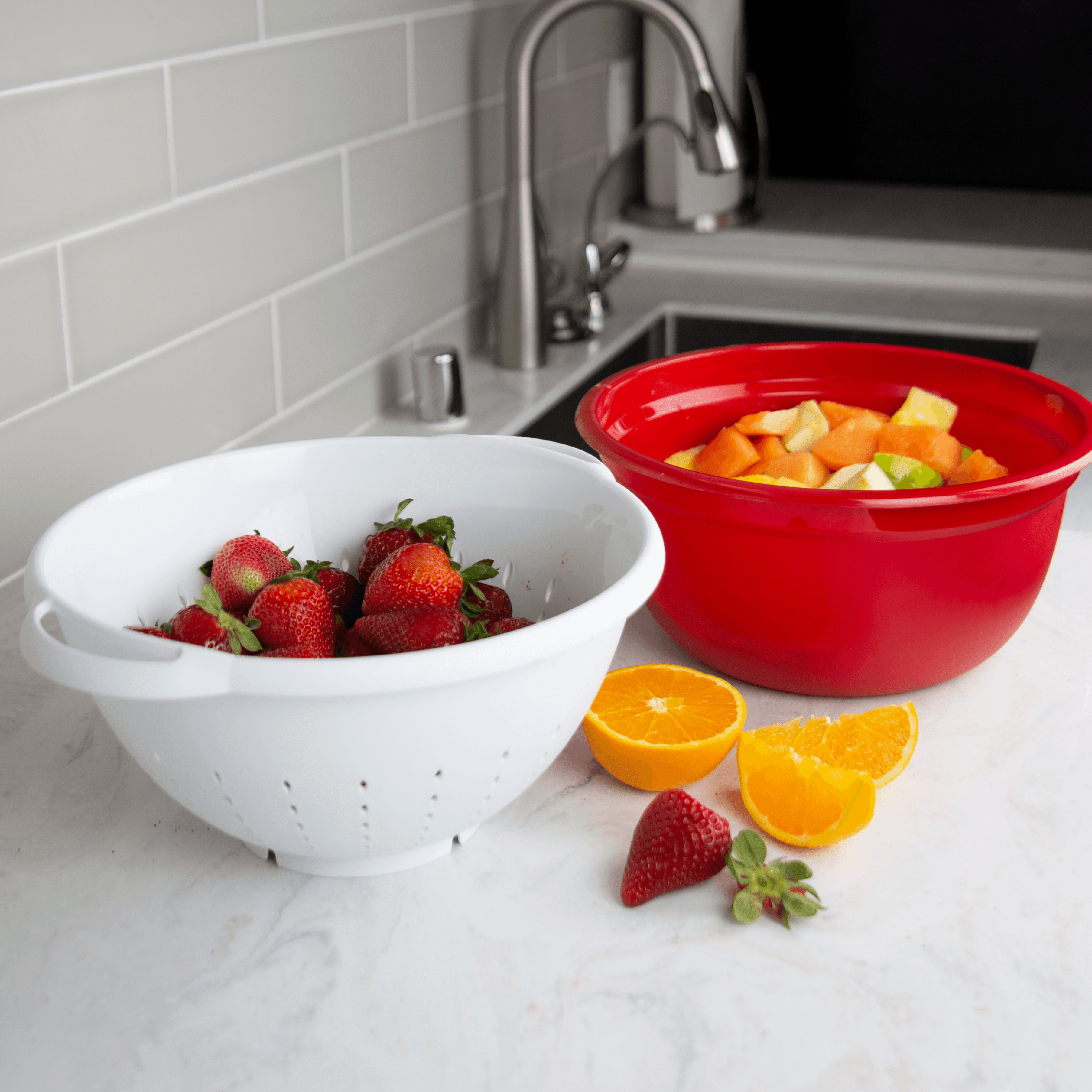 - Includes white 5-quart colander and red 6-quart mixing bowl