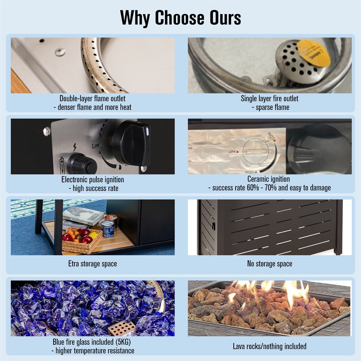 Our patio rattan sofa set with 46 inch 50,000 BTU fire pit table is suitable for both indoor and outdoor use. Rattan design is stylish to be a great decoration in your garden or yard. At the same time, it’s easy to clean and need no special maintenance. Steel frame is durable and sturdy enough to have 350 lbs load-bearing capacity for single seat. Our PE wicker is 35% thicker than others on the market, it is fully hand-woven, and has a more compact construction, making the sofa stronger and ensuring long use. We use upgraded fabric which are more breathable and soft, higher color fastness compared with traditional fabrics. Extra thicken padded cushion will bring you a better outdoor life. With detachable covers, it’s convenient to clean. Besides, sofas can be combined in different ways according to your idea. The fire pit table features a superior stainless steel burner and fire bowl which ensures outdoor durability. It is 50,000BTU heat output by using propane fuel to provide burning without ash or smoke. Our propane fire pit tables are CSA certified to ensure they are qualified and safe to use. Electric ignition system for easy starting , the flame can be adjusted to high or low with the knob depending on your needs. Besides, there is extra storage space for you putting things. Sitting around a fire pit in the nights, gazing at it, enjoying the company of friends and guests is something that everyone would love to do.It is worth mentioning that it comes with 11lbs free blue fire glass.