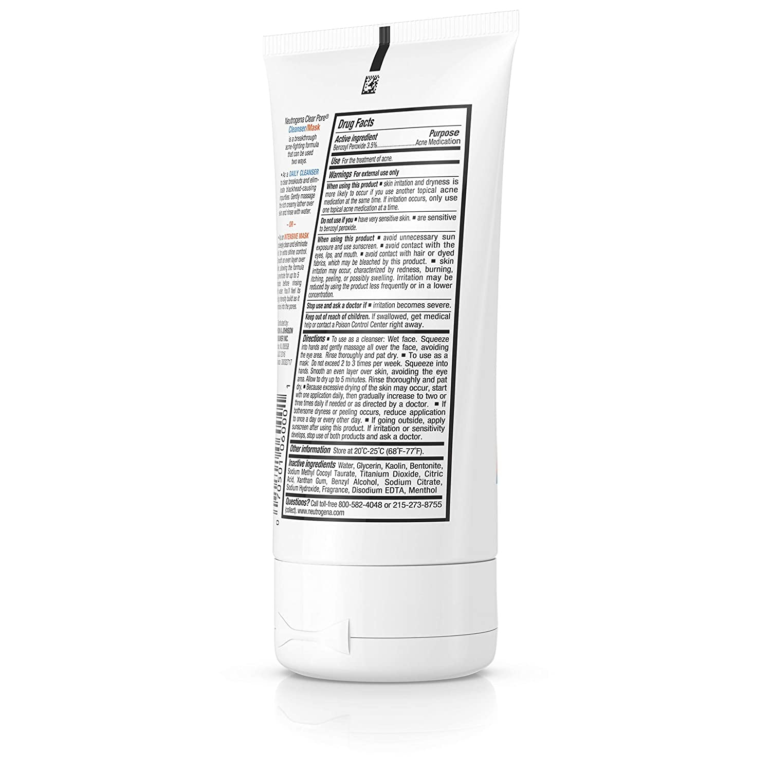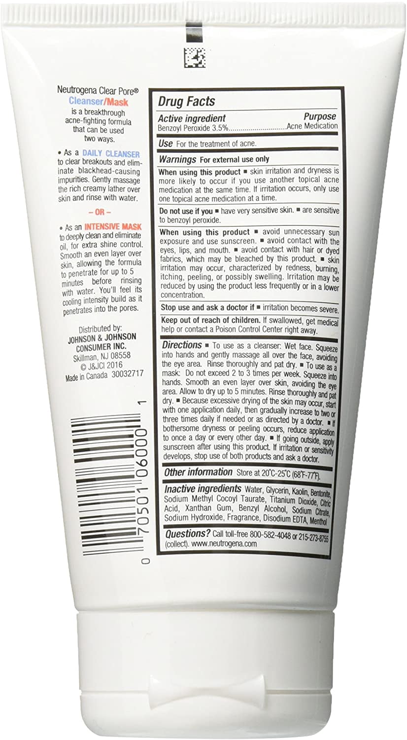 Dermatologist recommended.Acne TreatmentNeutrogenaActive Ingredients:Benzoyl Peroxide 3.5%To use as a cleanser: Wet face. Squeeze into hands. Apply to face and massage gently. Rinse thoroughly. To use as a mask: Do not exceed 2 to 3 times per week. Squeeze into hands. Smooth an even layer over skin. Allow to dry for up to five minutes. Rinse thoroughly. If excessive drying or bothersome peeling occurs, reduce application to once per week (mask use) or every other day (cleanser use). This product may bleach hair or dyed fabrics. Avoid storage at extreme temperatures (below 40 degrees F and above 100 degrees F).Inactive Ingredients:Water; Glycerin; Kaolin; Bentonite; Sodium Methyl Cocoyl Taurate; Titanium Dioxide; Trideceth-9; PEG-5 Ethylhexanoate; Menthol; Sodium Citrate; Xanthan Gum; Disodium EDTA; Citric Acid; FragranceUses:For the treatment of acne. A breakthrough acne-fighting formula that can be used two ways. As a daily cleanser to kill the bacteria that can cause blackheads and breakouts. Gently massage the rich creamy lather over skin and rinse with water. As an intensive mask for deep cleansing and extra oil control. Smooth an even layer over skin, allowing the formula to penetrate for up to 5 minutes before rinsing with water. You’ll feel its cooling intensity build as it penetrates into the pores.For external use only. Do not use this medication if you have very sensitive skin or if you are sensitive to benzoyl peroxide. This product may cause irritation. Ask a doctor or pharmacist before use if you are. Currently under the care of a physician for your acne. Using other topical acne medication at the same time or immediately following use of this product. This may increase dryness or irritation of the skin. If this occurs, only one medication should be used unless directed by a doctor. When using this product avoid contact with eyes. If contact occurs, flush thoroughly with water. Stop use and ask a doctor if irritation becomes severe. Keep out of reach of children. Keep away from lips and mouth. If swallowed, get medical help or contact a Poison Control Center right away.Dermatologist recommended.Acne TreatmentNeutrogenaActive Ingredients:Benzoyl Peroxide 3.5%To use as a cleanser: Wet face. Squeeze into hands. Apply to face and massage gently. Rinse thoroughly. To use as a mask: Do not exceed 2 to 3 times per week. Squeeze into hands. Smooth an even layer over skin. Allow to dry for up to five minutes. Rinse thoroughly. If excessive drying or bothersome peeling occurs, reduce application to once per week (mask use) or every other day (cleanser use). This product may bleach hair or dyed fabrics. Avoid storage at extreme temperatures (below 40 degrees F and above 100 degrees F). Inactive Ingredients:Water; Glycerin; Kaolin; Bentonite; Sodium Methyl Cocoyl Taurate; Titanium Dioxide; Trideceth-9; PEG-5 Ethylhexanoate; Menthol; Sodium Citrate; Xanthan Gum; Disodium EDTA; Citric Acid; FragranceUses:For the treatment of acne. A breakthrough acne-fighting formula that can be used two ways. As a daily cleanser to kill the bacteria that can cause blackheads and breakouts. Gently massage the rich creamy lather over skin and rinse with water. As an intensive mask for deep cleansing and extra oil control. Smooth an even layer over skin, allowing the formula to penetrate for up to 5 minutes before rinsing with water. You’ll feel its cooling intensity build as it penetrates into the pores. For external use only. Do not use this medication if you have very sensitive skin or if you are sensitive to benzoyl peroxide. This product may cause irritation. Ask a doctor or pharmacist before use if you are. Currently under the care of a physician for your acne. Using other topical acne medication at the same time or immediately following use of this product. This may increase dryness or irritation of the skin. If this occurs, only one medication should be used unless directed by a doctor. When using this product avoid contact with eyes. If contact occurs, flush thoroughly with water. Stop use and ask a doctor if irritation becomes severe. Keep out of reach of children. Keep away from lips and mouth. If swallowed, get medical help or contact a Poison Control Center right away.