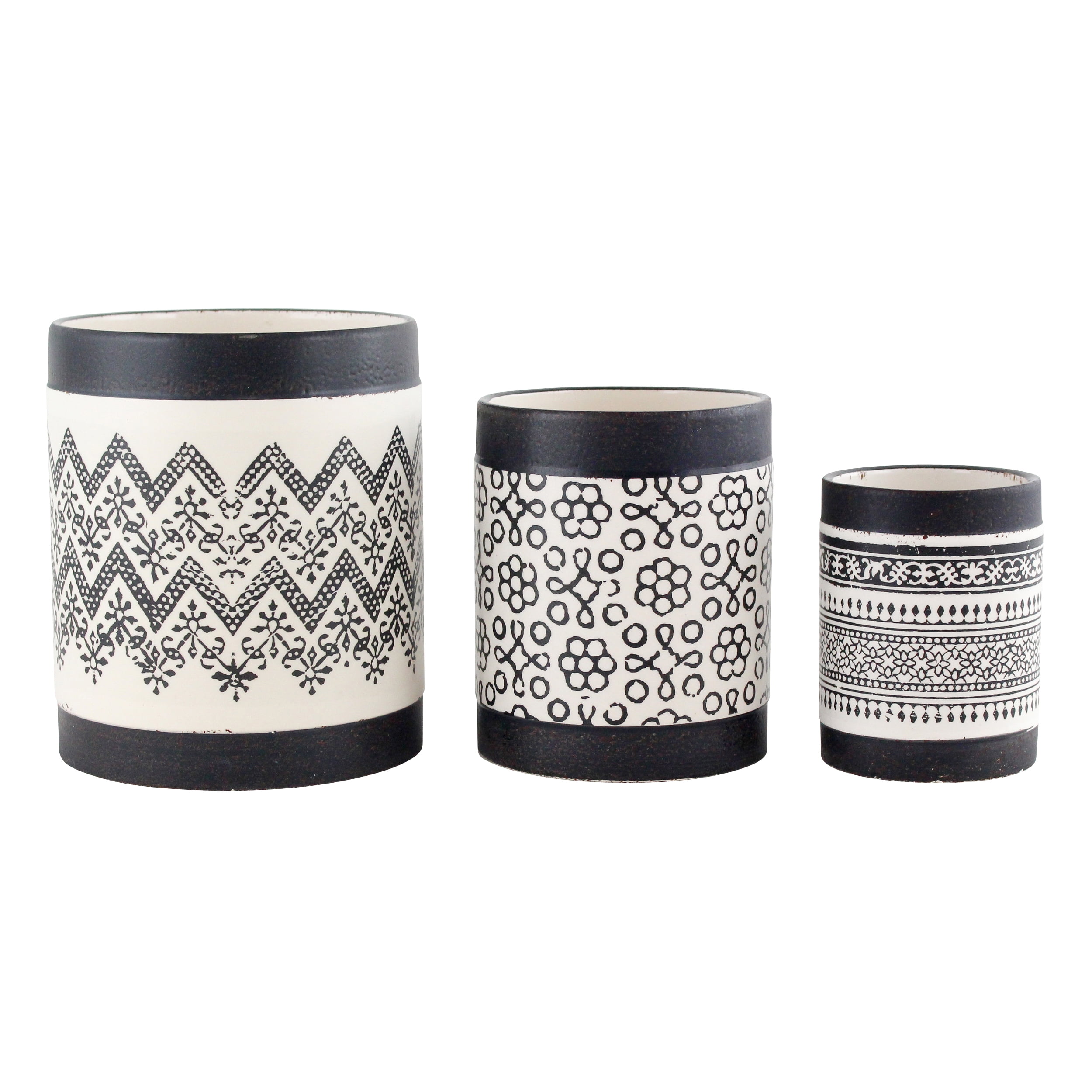 This set of three planters comes in three distinct patterns. Each planter features a monochrome floral motif surrounded with black bands. When used as a trio or separately, they shine on any table or shelf. Perfect for your favorite floral accents or fake plants, they?re charming pieces that will blend with many styles.