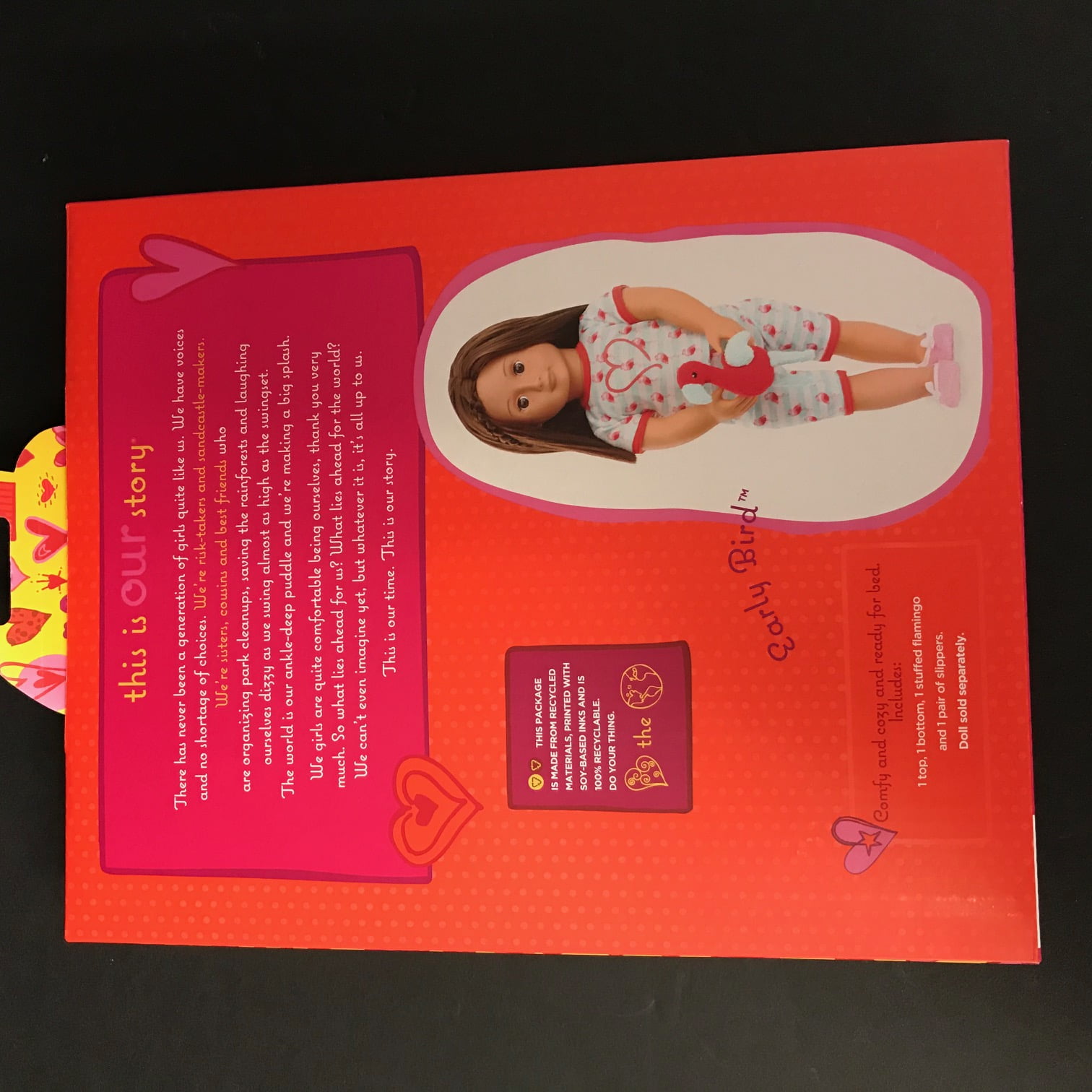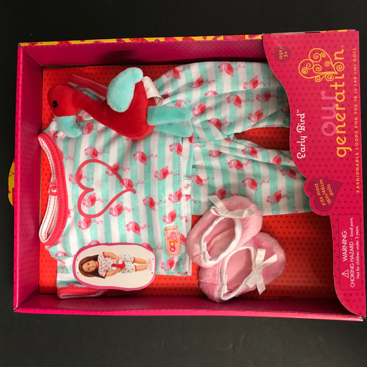 Rise and shine with these fun and comfy Our Generation Early Bird pajamas, a fabulous flamingo-themed sleepwear outfit for 18-inch dolls! This fun, short-sleeved pajama top and short set is in a cute blue and white stripe with bright contrasting trim. The whole set is covered with an adorable flamingo print. The fluffy pink slippers will keep your doll cozy, and she can snuggle up at night with the adorable doll-sized flamingo plush toy. For even more sleepy time inspiration, check out the whole range of sleepover-themed outfits and accessories from Our Generation! There are great bunk beds, pajama sets, sleeping bags and more. The doll in the pictures is June. (Dolls sold separately, available at Target. Compatible with American Girl dolls.)Number of Pieces: 5 Dimensions (Overall): 10.6 Inches (H) x 8.5 Inches (W) x 1.75 Inches (D) Suggested Age: 3 Years and Up Weight: .41 Pounds Material: Polyester Includes: Outfits, Slippers Doll Theme: Home and Family CPSC Choking Hazard Warnings: Choking_hazard_small_parts Doll gender: Girl Fits Doll Size: 18 Inches Battery: No Ba